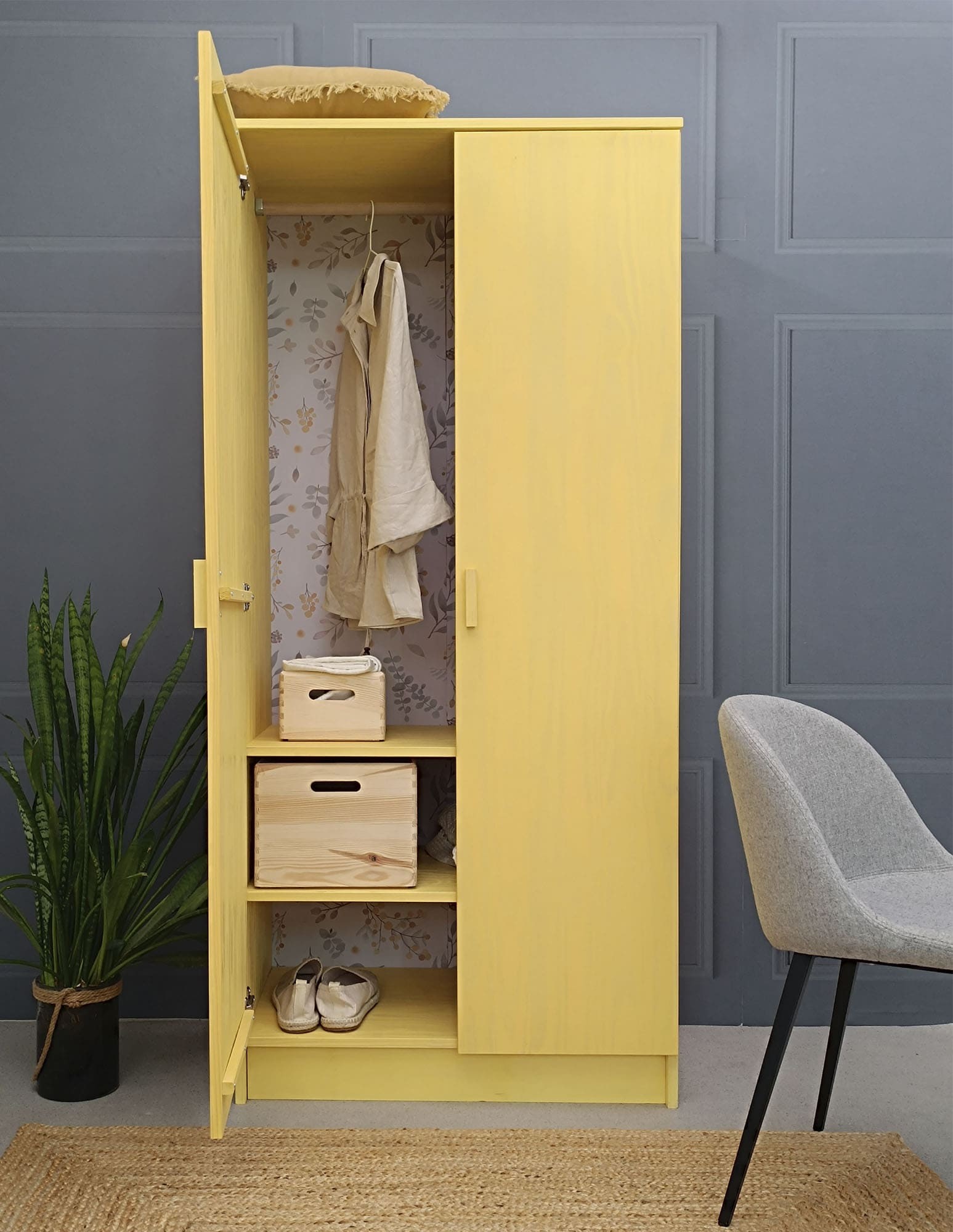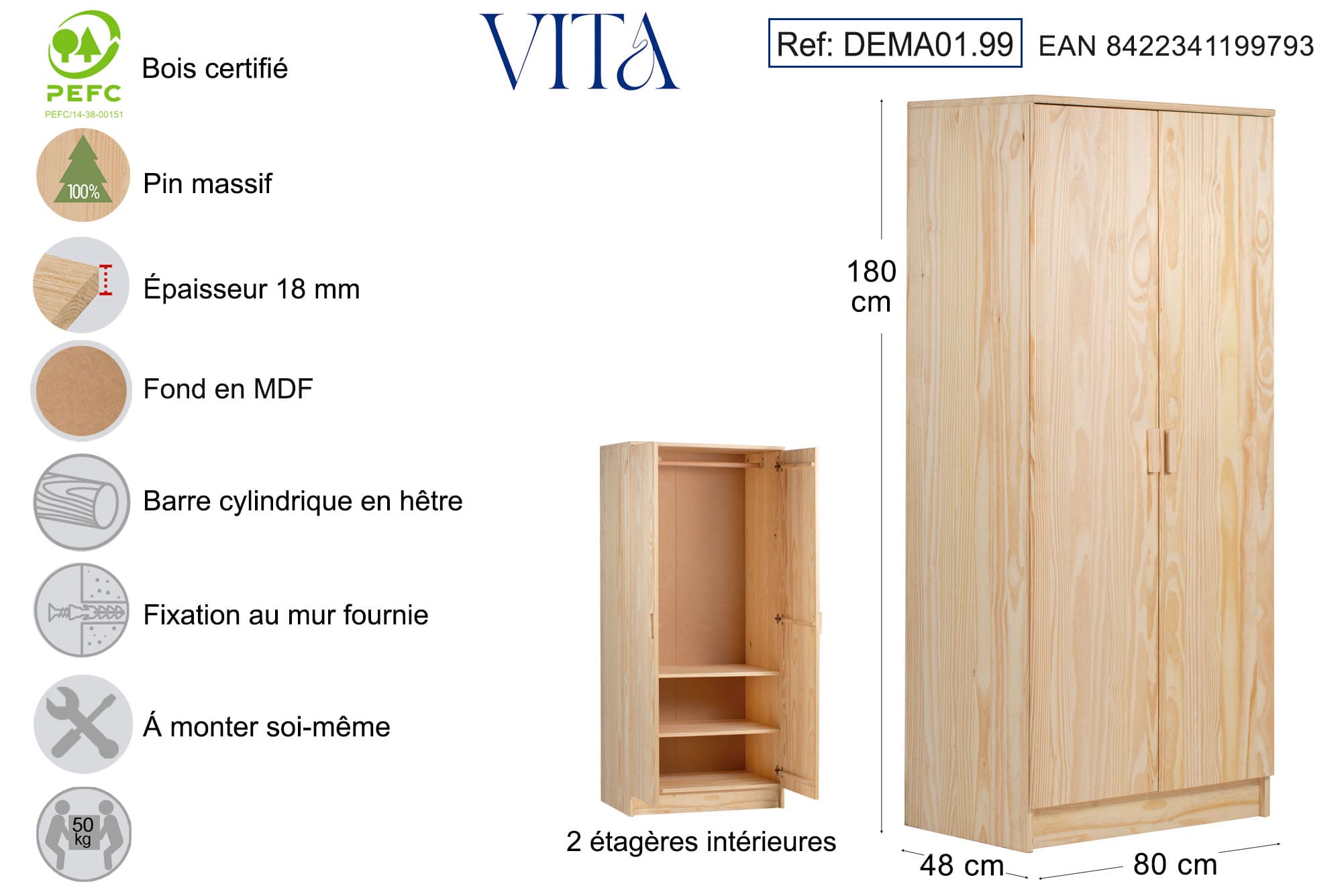 • Armoire en pin VITA avec 2 étagères intérieures et tringle cylindrique en bois de hêtre
