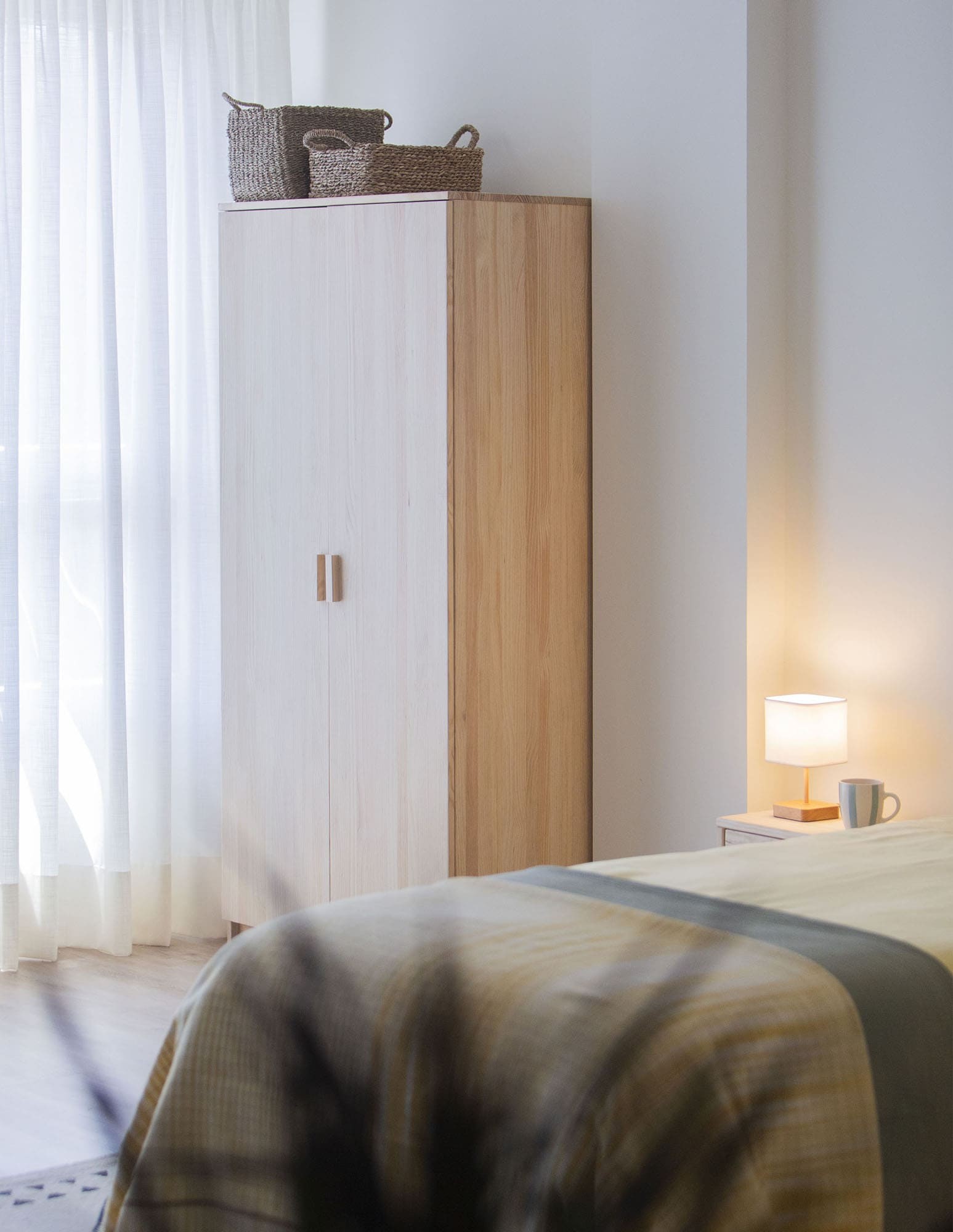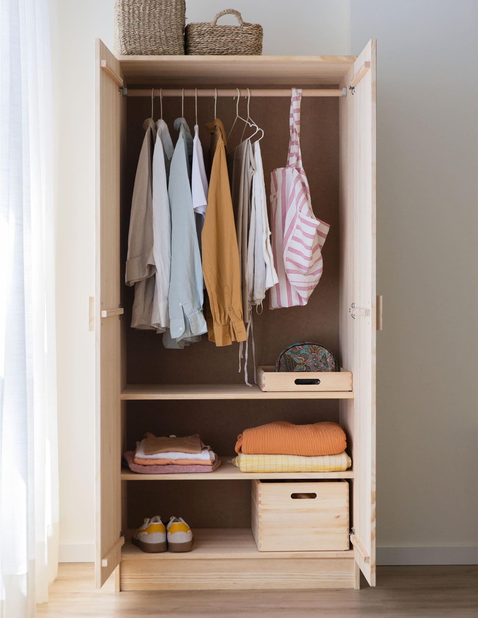 Les portes de l’armoire en pin VITA dissimulent un intérieur très fonctionnel: une tringle cylindrique en bois de hêtre robuste pour suspendre les cintres, ainsi que deux étagères en bois de pin permettant d’organiser vêtements, linges ou accessoires en toute facilité. Les poignées en bois, intégrées naturellement au design, accompagnent les lignes épurées du meuble avec harmonie. Le résultat : une armoire en bois de pin intemporelle et fonctionnelle, qui dégage une sensation de sérénité grâce à la noblesse du matériau.