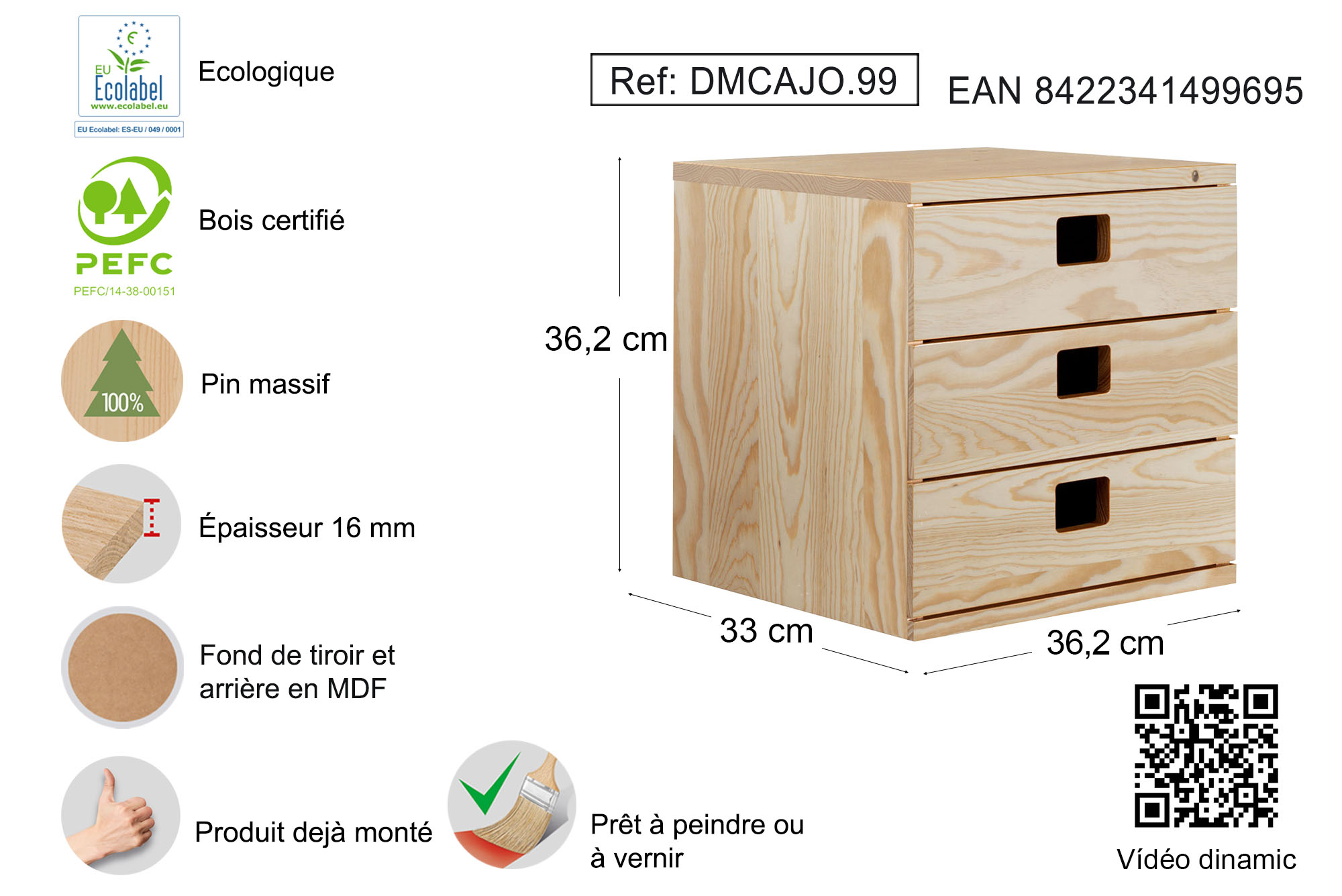 - Bloc Dinamic en pin massif avec 3 tiroirs. Fond de tiroir et arrière en mdf.
