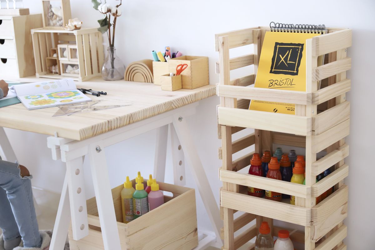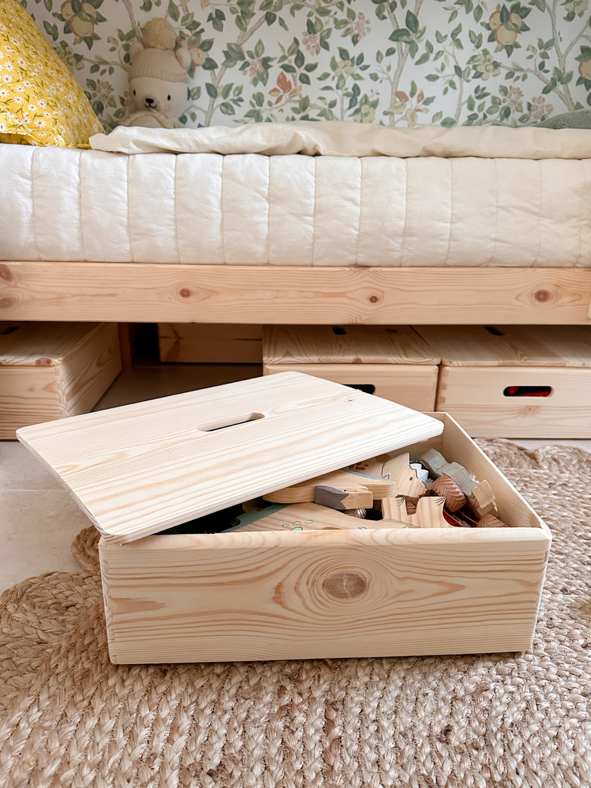 Les caisses en bois sont une solution très polyvalente. Vous pouvez les placer sur des étagères, dans des armoires, les empiler dans un coin de la maison ou même les glisser sous le lit, un espace souvent oublié. Elles permettent d’optimiser l’espace disponible et de garder les jouets rangés sans effort.