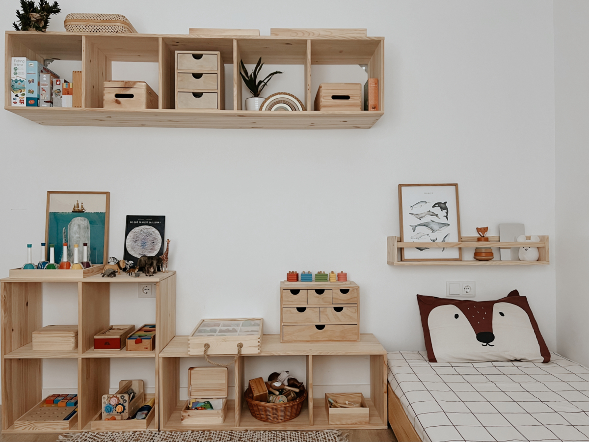 Ces étagères permettent aux enfants de voir ce qu’ils ont et d’apprendre à ranger eux-mêmes. Et si à un moment donné vous souhaitez dissimuler une partie du contenu, il suffit d’ajouter des accessoires comme des portes ou des boîtes.