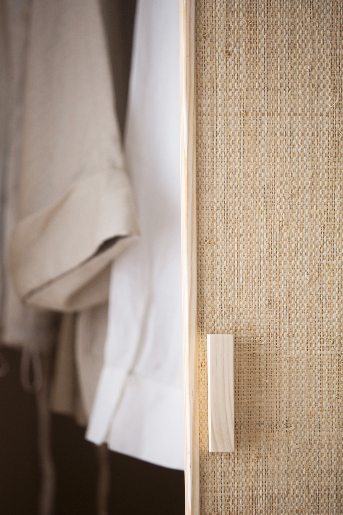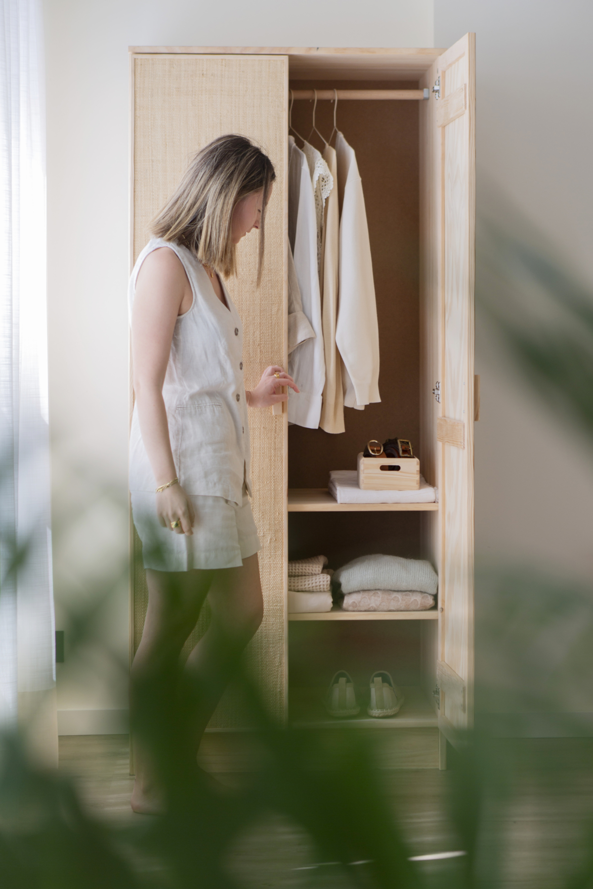 Un meuble en raphia et bois naturel avec une barre cylindrique pour suspendre vos vêtements et deux étagères intérieures pour vos accessoires. Son design intemporel et fonctionnel permet également de l’utiliser dans une entrée pour accrocher vestes et manteaux.