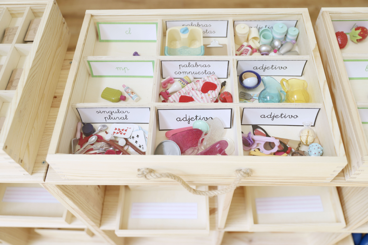 Les boîtes et plateaux en bois avec compartiments permettent de trier et d’organiser le matériel, ce qui facilite la concentration et l’attention pendant les activités. Ce type de rangement permet non seulement de garder l’espace bien rangé, mais aussi d’enseigner aux enfants des techniques d’organisation dès leur plus jeune âge.