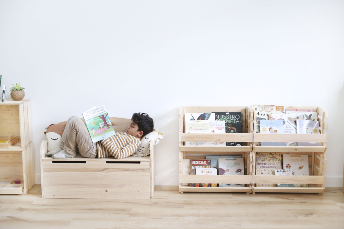 La création d’un coin lecture confortable est essentielle pour encourager les enfants à lire. Un banc-coffre en bois naturel ADA, accompagné de meubles présentant des couvertures de livres, invite les plus petits à se plonger dans le monde de la lecture. Cet espace doit être confortable et calme, avec des coussins et un éclairage doux, afin que les enfants associent la lecture à des moments agréables et relaxants.