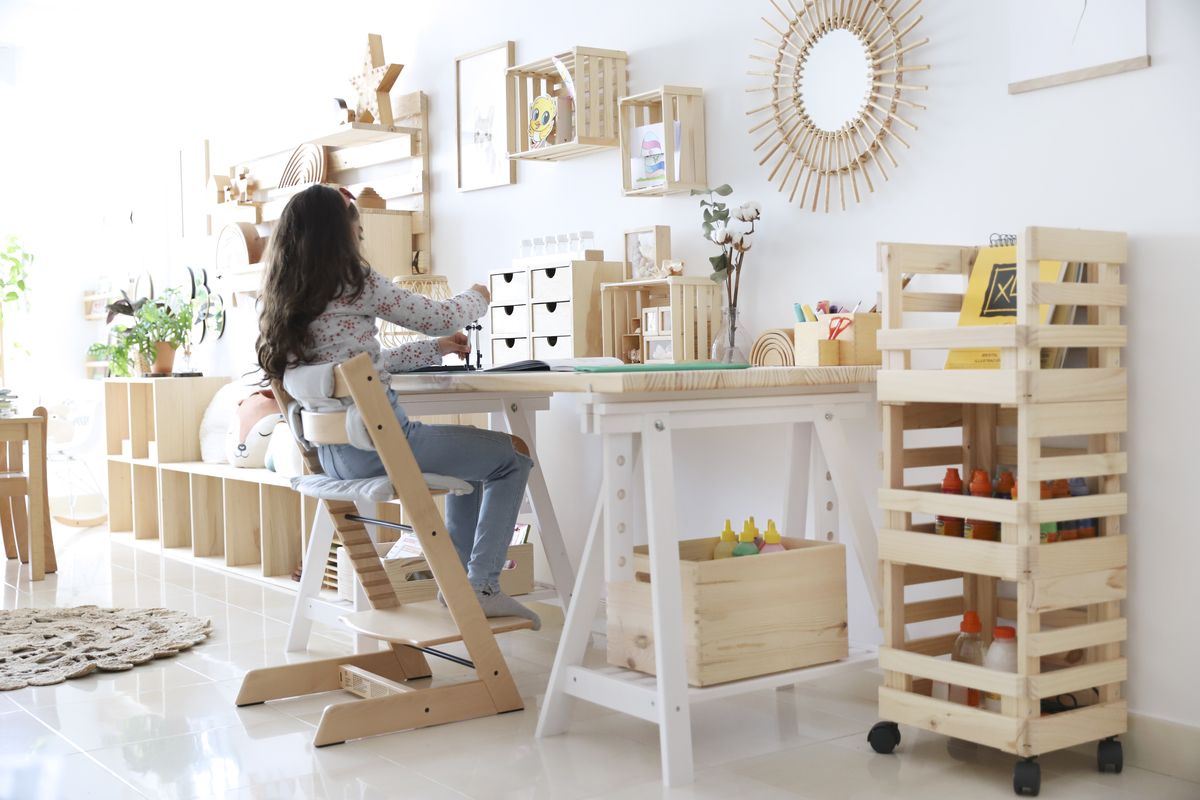 • Rangement : utilisez des caissons, paniers ou étagères pour garder crayons, cahiers et fournitures à portée de main, sans encombrer visuellement.
