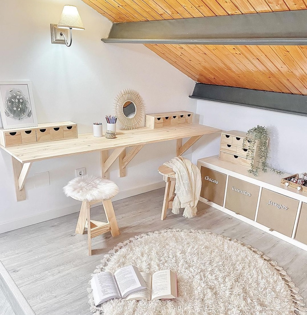 Une autre façon d’aménager un bureau consiste à placer deux tables face à face. À cette occasion, Clara Valentí (sur Instagram, @_claravm_) a opté pour des planches de bois de 140 x 70 cm et des treteaux Deco de couleur blanche. Une fois de plus, les mini-blocs tiroirs et les boîtes en pin massif sont indispensables pour maintenir l’ordre dans tout espace de travail ou d’étude. Si vous possédez également l’une des armoires de la collection Dinamic, vous multiplierez vos rangements en mettant les choses à l’abri des regards.