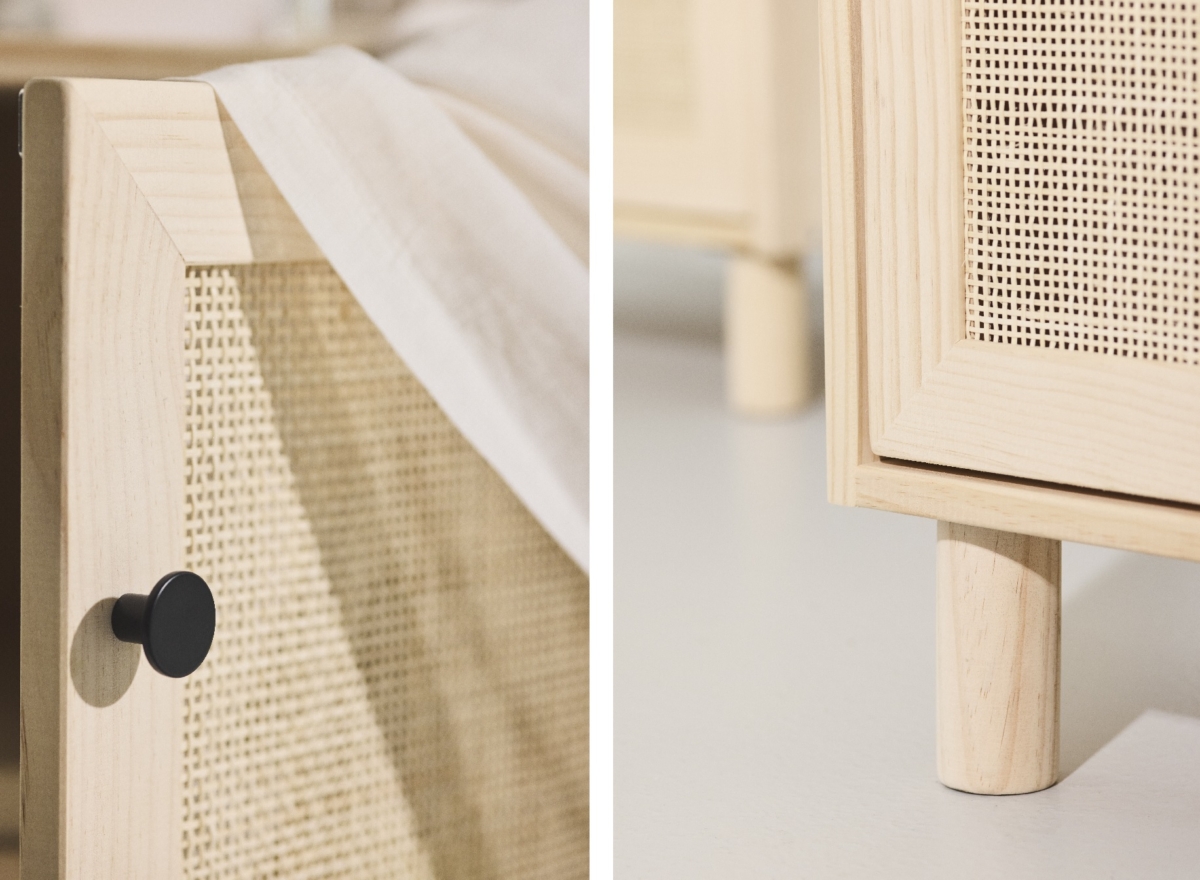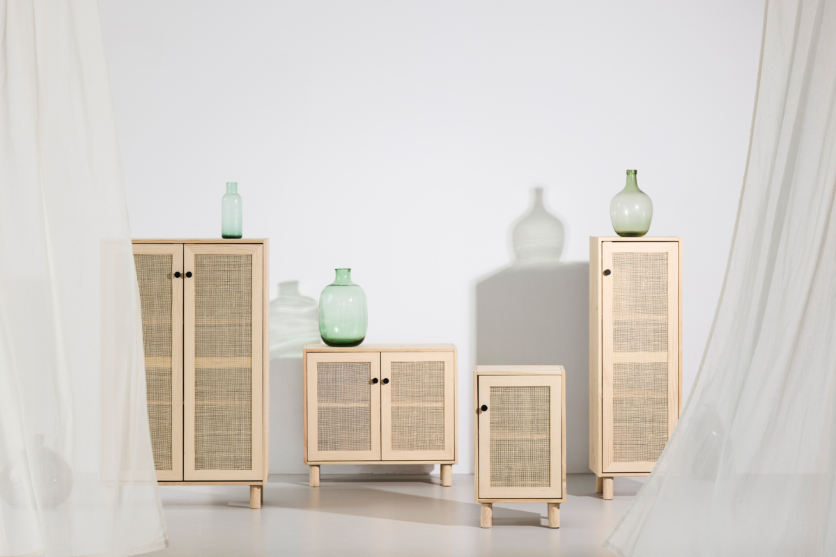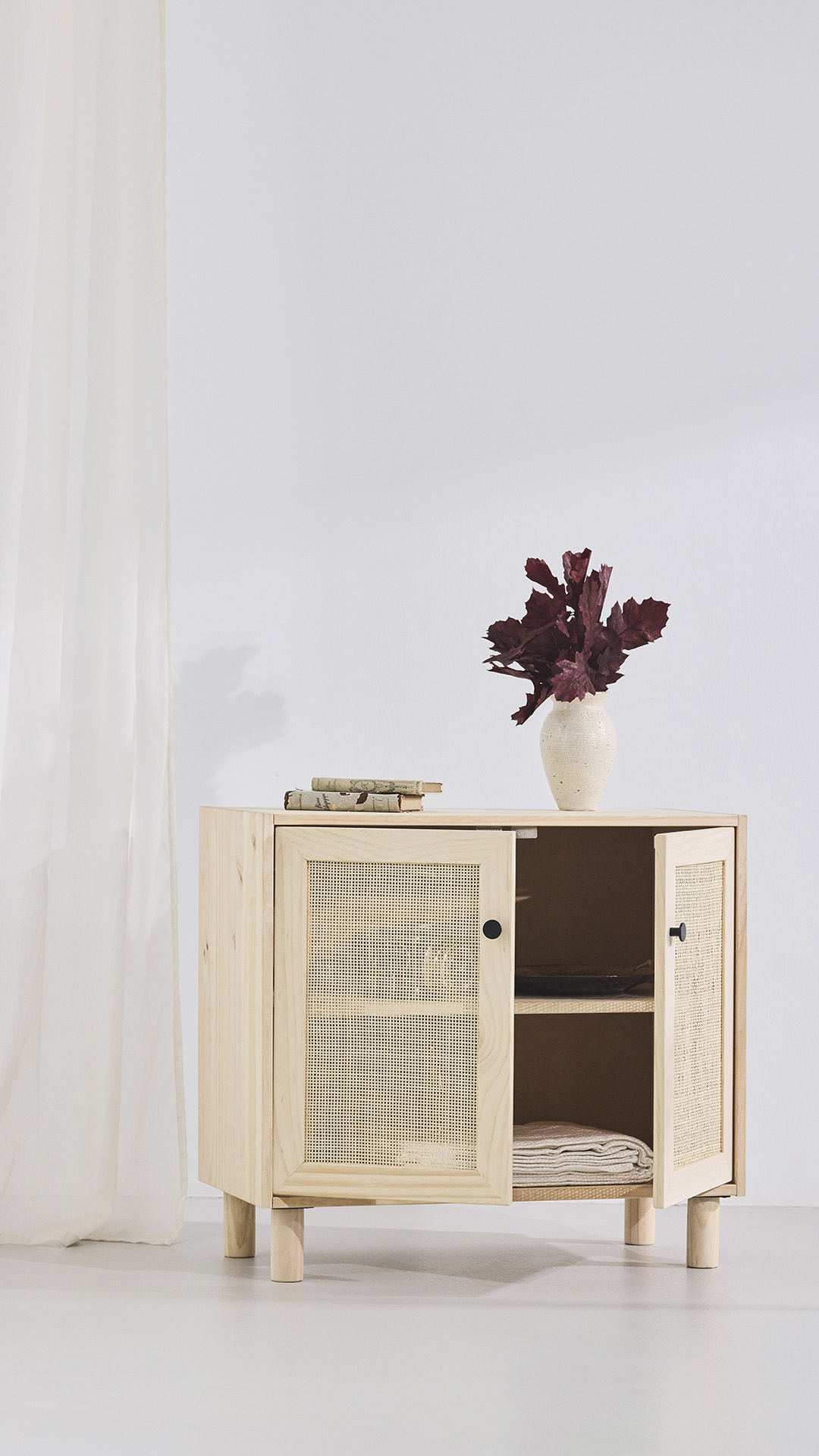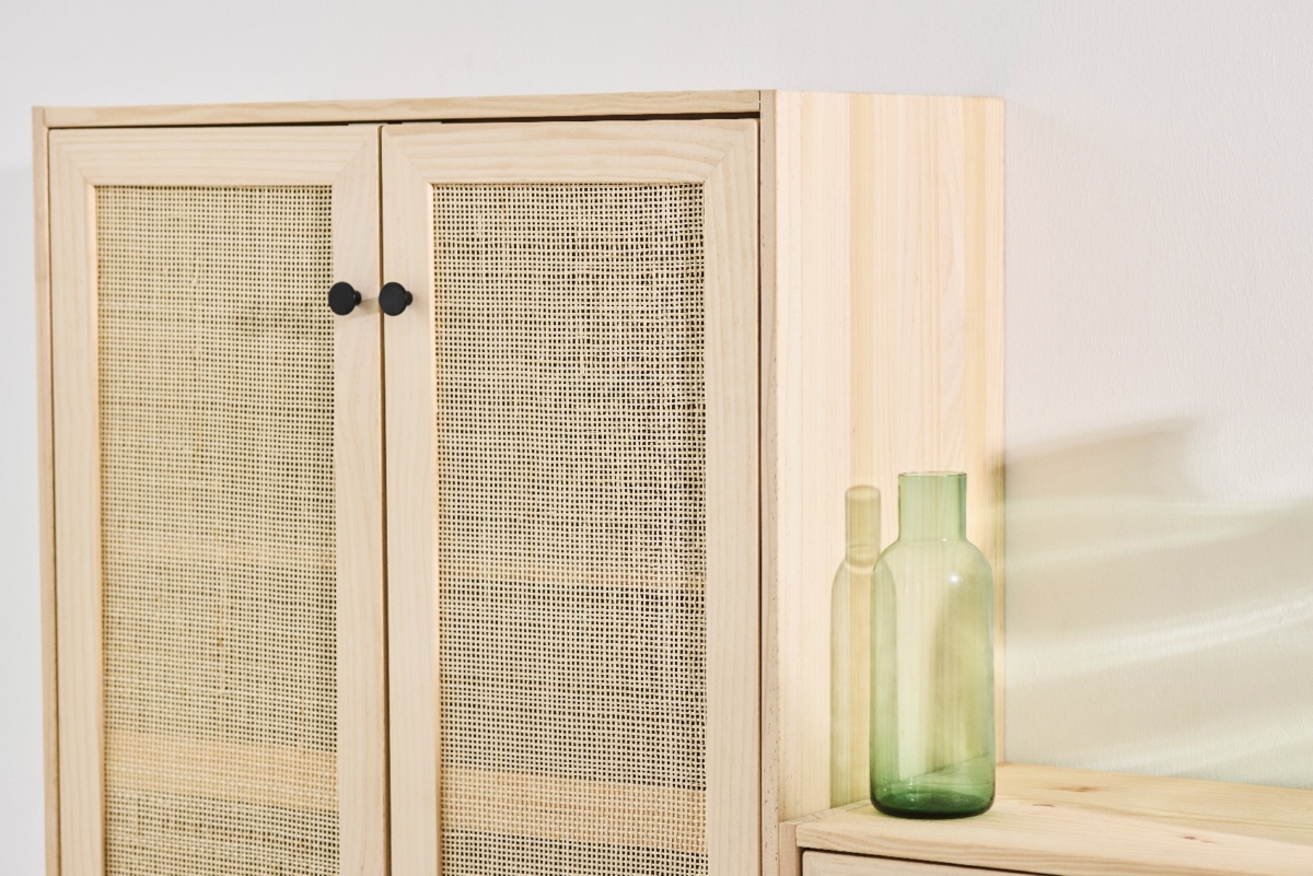 Les portes en rotin de ces quatre meubles sont dotées de poignées en métal noir avec une finition mate. Leurs pieds ronds sont également en pin pour plus de stabilité et de chaleur. Vous pouvez placer chaque pièce seule ou les combiner pour créer un ensemble plus grand, plus fonctionnel et plus harmonieux dans n’importe quelle partie de la maison. En outre, grâce à son design intemporel, cette collection s’adapte aussi bien aux styles de décoration traditionnels que contemporains.