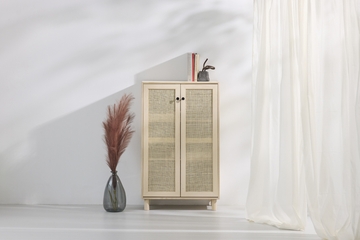 La nouvelle armoire à deux portes en rotin de la collection SENSE dispose de deux étagères intérieures et offre un espace de rangement optimal pour tout ce que vous souhaitez garder à l’abri des regards. Elle peut être adaptée à différents espaces et besoins dans la maison. Dans une chambre, pour ranger des vêtements ou des accessoires ; dans le salon, pour ranger la vaisselle ; ou dans l’entrée.