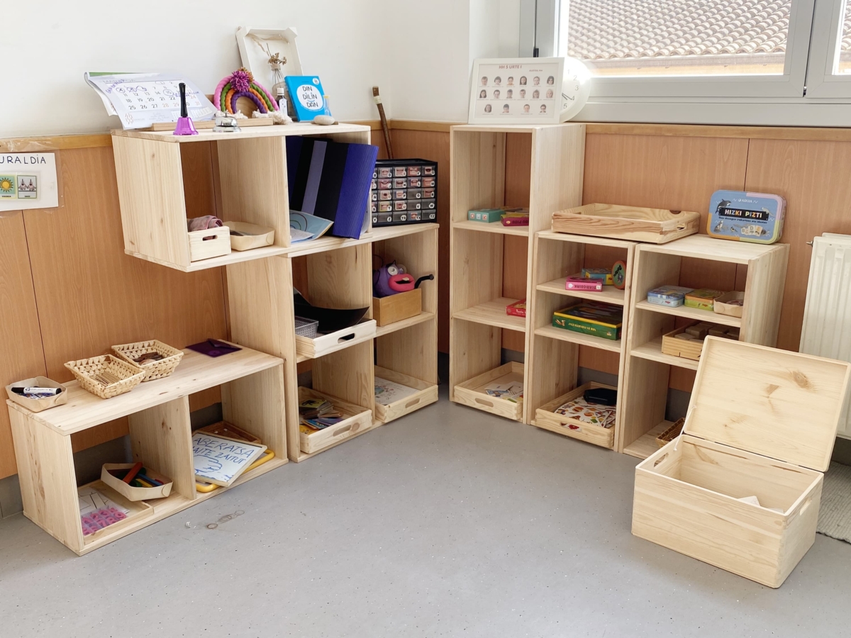 Les étagères cubes pour enfants DINAMIC sont parfaites pour organiser le matériel scolaire et sont également approuvées comme siège.
