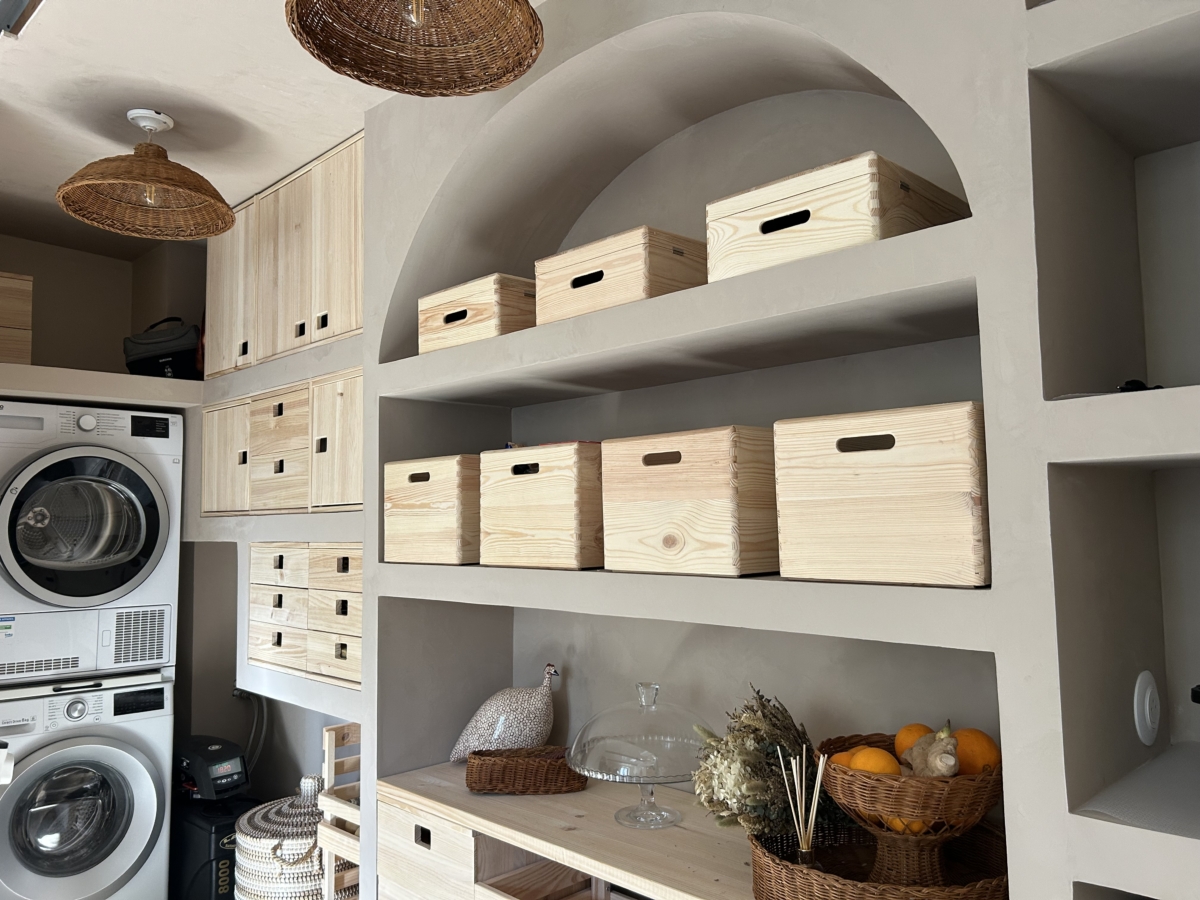 Dans le garde-manger, des boîtes en bois sans couvercle permettent de ranger les conserves, les bouteilles ou les petits accessoires de cuisine, et même les ustensiles de cuisine que vous n’utilisez pas tous les jours. Le résultat est un espace net et bien organisé, presque digne d’un magazine. Et le mieux, c’est que même ce garde-manger chaotique, que nous essayons tous de dissimuler au maximum, semble avoir un aspect beaucoup plus ordonné et élégant avec quelques boîtes en bois.