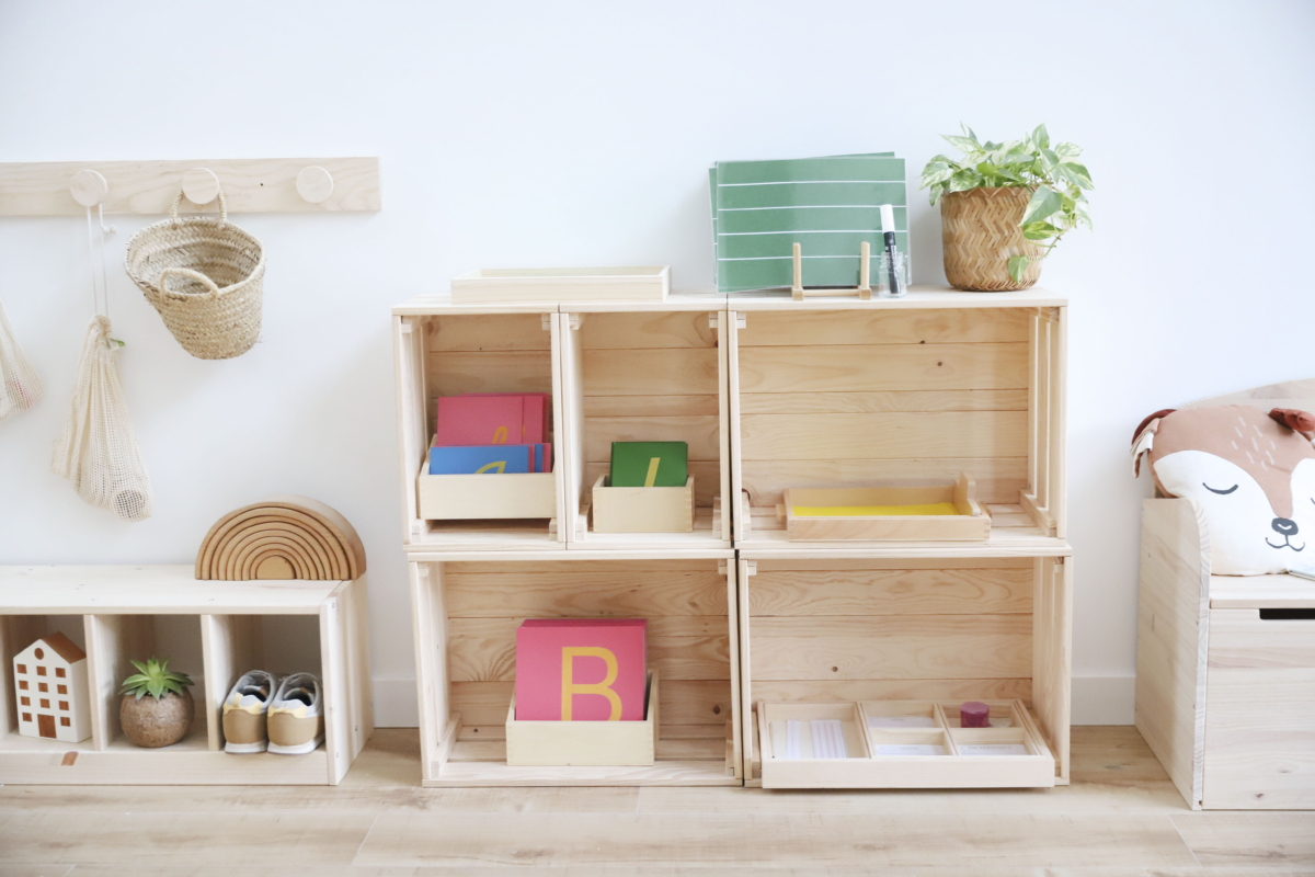 Étagère modulaire créée avec nos boîtes modulaires Home Box. Photo : Creciendo con Montessori