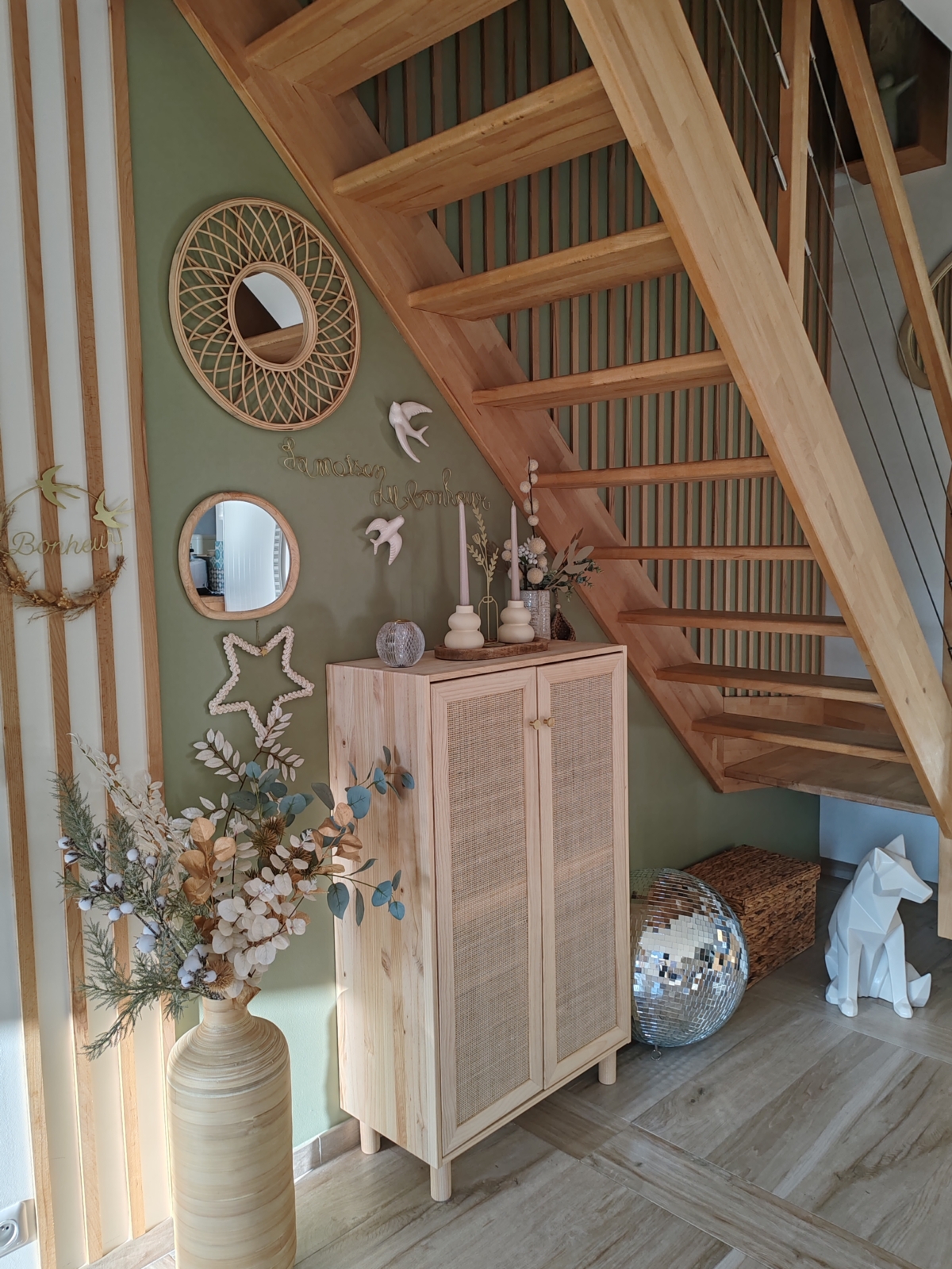 Nous ne cessons de vous surprendre ! Imaginez notre armoire en rotin dans cet espace inutilisé que l’on retrouve toujours sous un escalier. Oui, ce coin oublié peut être transformé en un espace de caractère. Utilisez-le pour créer un petit espace de rangement discret avec de la personnalité. Vous pouvez y ranger des souvenirs, des fournitures de bureau ou même en faire un endroit pratique pour ranger vos clés et vos objets quotidiens. Son design léger apportera une sensation de confort au passage.