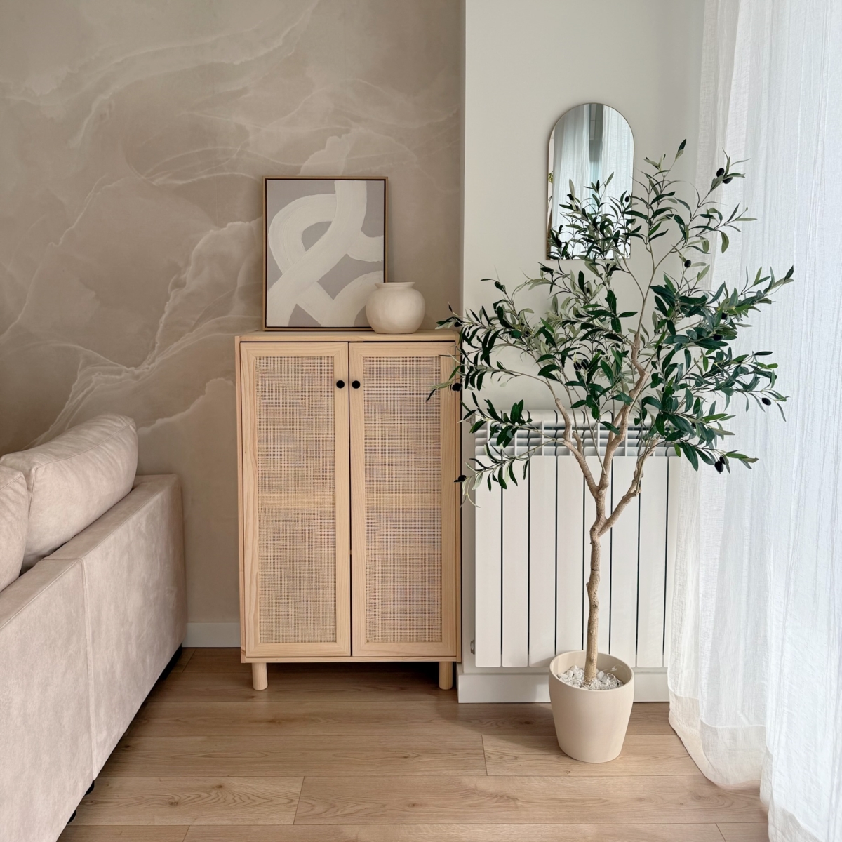 Vous pouvez également utiliser l’armoire en rotin SENSE comme meuble d’appoint élégant pour ranger des couvertures, des coussins ou même votre collection de disques vinyles dans le salon. Son esthétique naturelle s’intègre parfaitement dans les décors bohèmes, nordiques ou même rustiques. De plus, sa texture en rotin ajoute une touche cosy qui transforme tout espace en un lieu chaleureux et harmonieux.