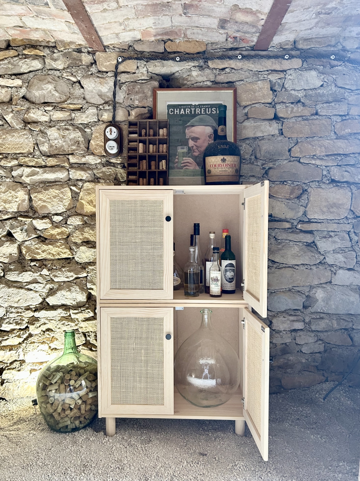 Et nous pourrions continuer à l’infini, mais voici la dernière idée : dans une cave. L’armoire en rotin SENSE est parfaite pour ranger les verres et les ustensiles liés au vin. Le rotin permet une ventilation naturelle qui contribue à maintenir l’intérieur de l’armoire au frais et à l’abri de l’humidité. Son esthétique naturelle s’intègre harmonieusement dans les caves rustiques ou modernes, apportant une touche de chaleur et d’élégance.