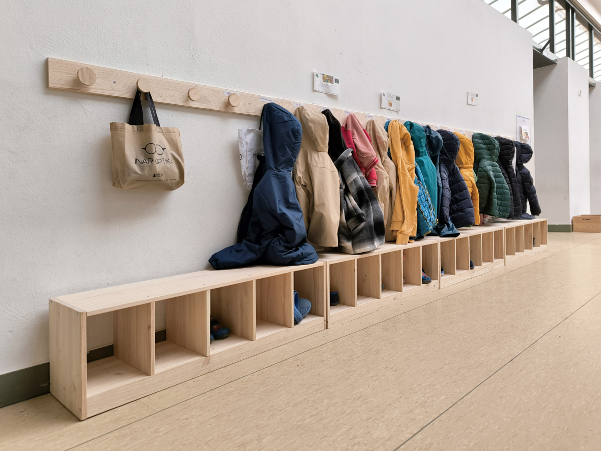 -À l’entrée des salles de classe, dans le couloir, nous avons placé des bancs et des portemanteaux VERA. Ils servent à ranger les pantoufles et à s’asseoir. Chaque enfant a son propre portemanteau et chaque crochet est aligné avec la case correspondante sur le banc. Nous avons même réfléchi au type de crochet le plus approprié pour leur permettre de suspendre facilement leurs vestes.
