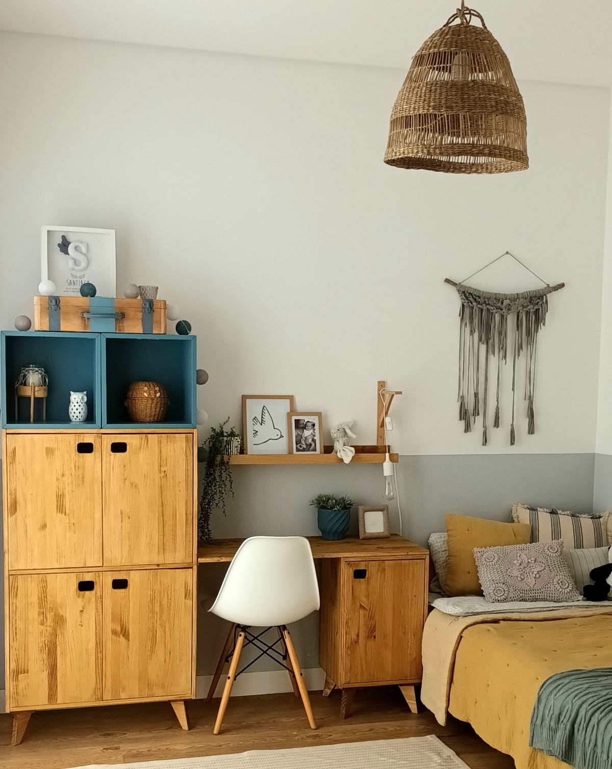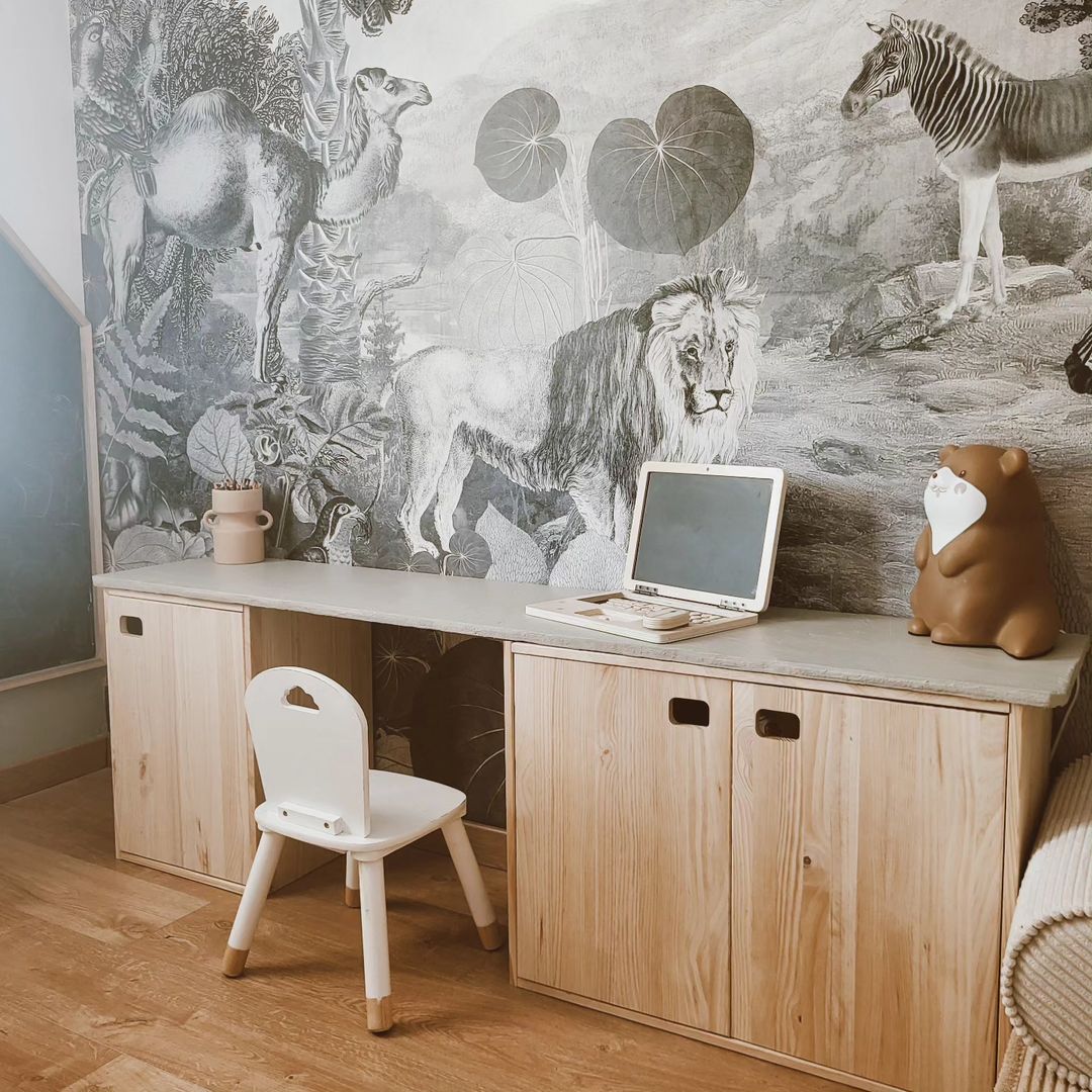 Un bureau double avec des tréteaux en bois est une solution idéale pour les chambres partagées par deux enfants, offrant un espace de travail spacieux et fonctionnel pour les deux. Chaque côté du bureau peut être personnalisé pour répondre aux besoins individuels des enfants, ce qui permet à chaque enfant d’avoir son propre espace pour étudier et se consacrer aux activités créatives. Pour disposer d’un espace de rangement et ne pas encombrer l’espace de travail, vous pouvez ajouter des blocs-tiroirs.