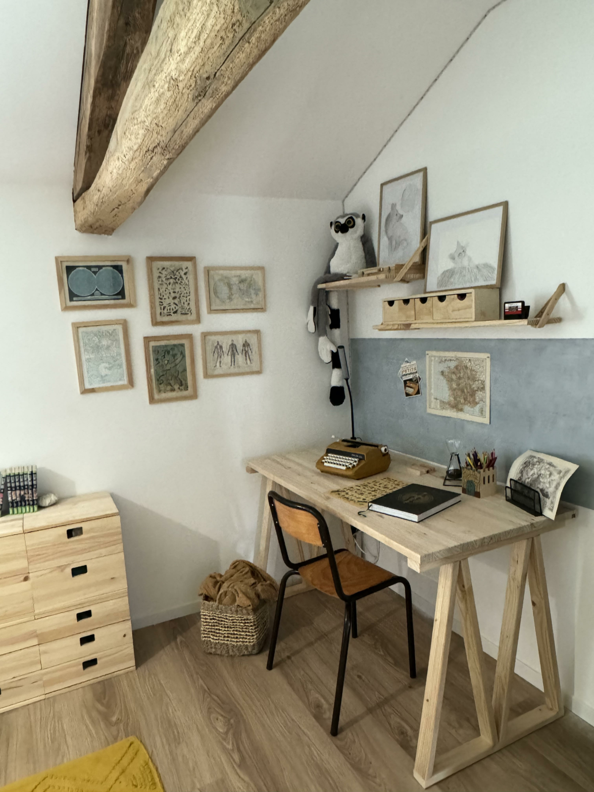 Le bureau à pieds Bok est un excellent choix pour ceux qui recherchent la polyvalence et l’originalité. Les pieds de ce bureau sont conçus pour permettre deux positions. Pour ceux qui ont besoin d’un espace de rangement supplémentaire, une solution pratique consiste à placer des étagères au mur. En complétant le bureau par des blocs-tiroirs en bois, on optimise encore l’espace pour ranger les fournitures scolaires et autres objets essentiels de manière organisée. Cet ensemble permet non seulement de garder l’espace de travail dégagé, mais aussi de créer un environnement ordonné et accueillant, idéal pour étudier et faire preuve de créativité.