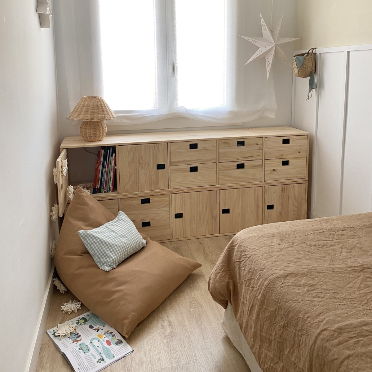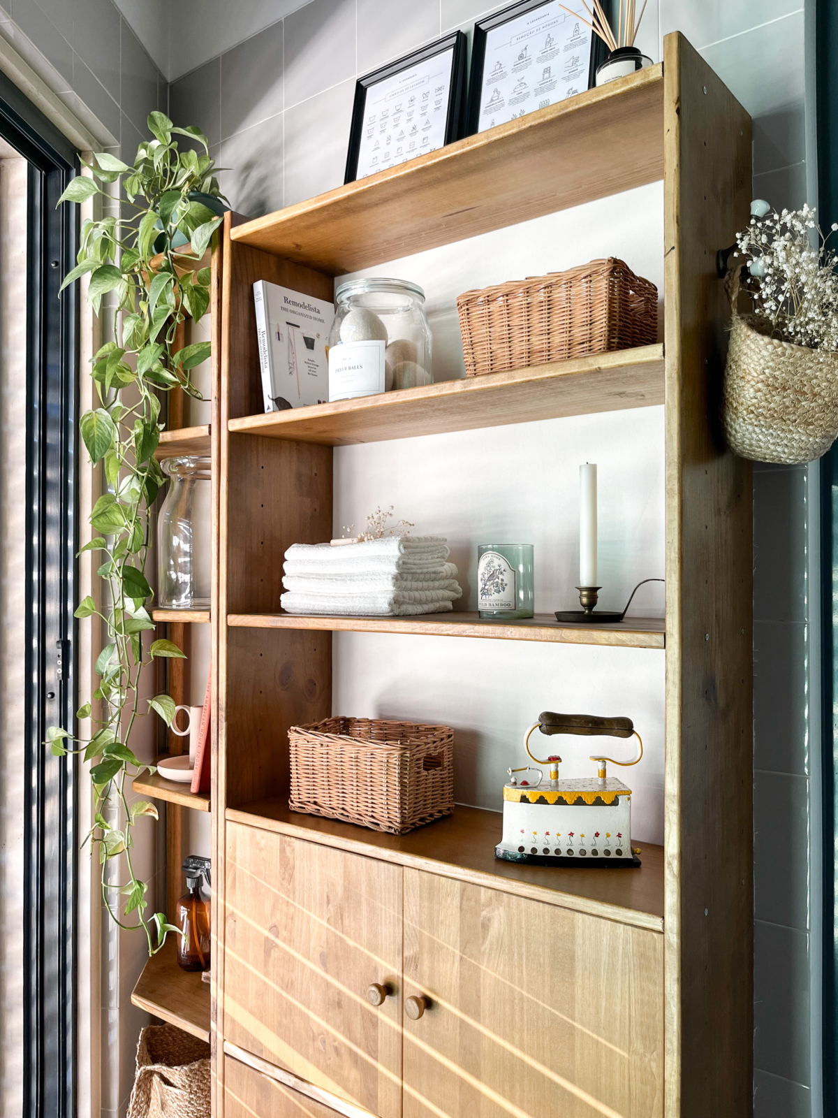 Photo Instagram : @mycozyhappyhome. Un vernis effet chêne a été appliqué sur l’étagère en bois Gala.