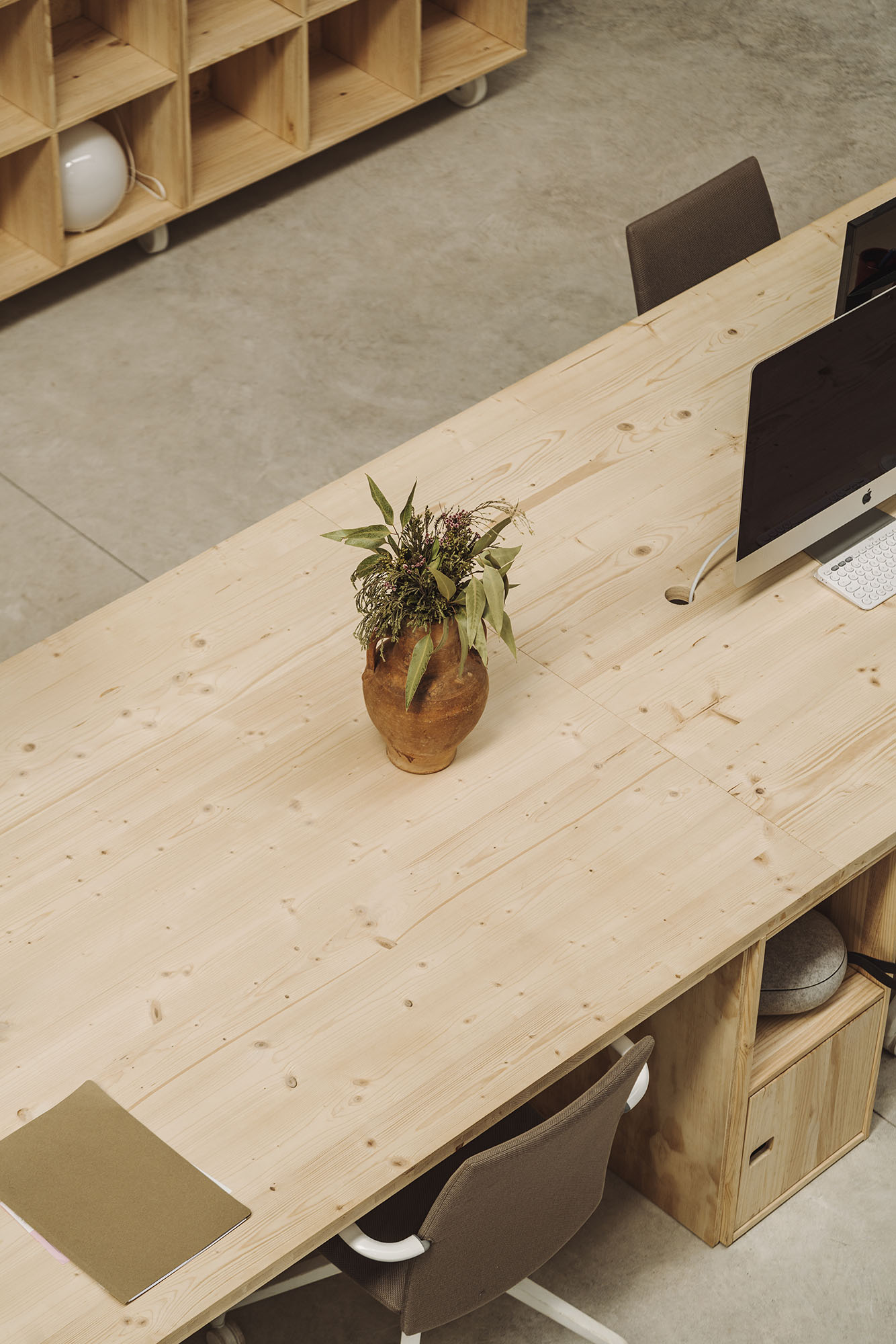 Les deux rangées du fond comprennent les tables de travail, les échantillons, le coin repas et le coin salon, avec la possibilité de changer complètement, car tout le mobilier est mobile. Des bases de meubles modulaires en épicéa et en pin sont utilisées pour créer des surfaces de stockage sur lesquelles des panneaux de bois stratifié sont utilisés pour lier le tout. En dessous, chaque meuble possède ses propres roulettes, ce qui permet d’adapter l’espace lorsque celui-ci doit être utilisé pour des activités avec un plus grand nombre de personnes.