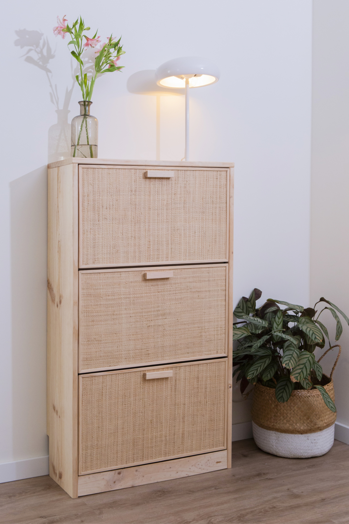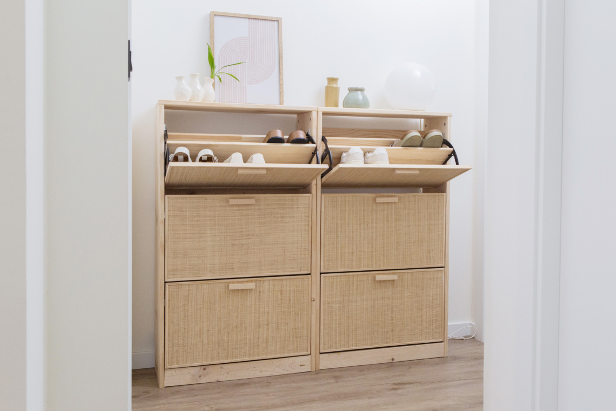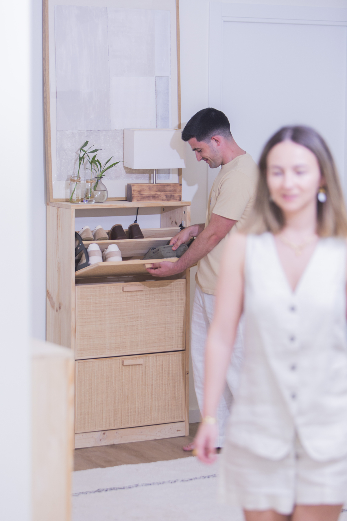 L’entrée est l’endroit parfait pour placer le meuble à chaussures. C’est la première chose que nous voyons en entrant et la dernière en sortant. Un meuble joli et fonctionnel ici accueille avec style. Si tu choisis un meuble à chaussures en bois naturel, tu apporteras chaleur et sensation de maison. Et s’il a en plus des détails en rotin, comme le modèle AURA, tu ajouteras texture et charme artisanal.