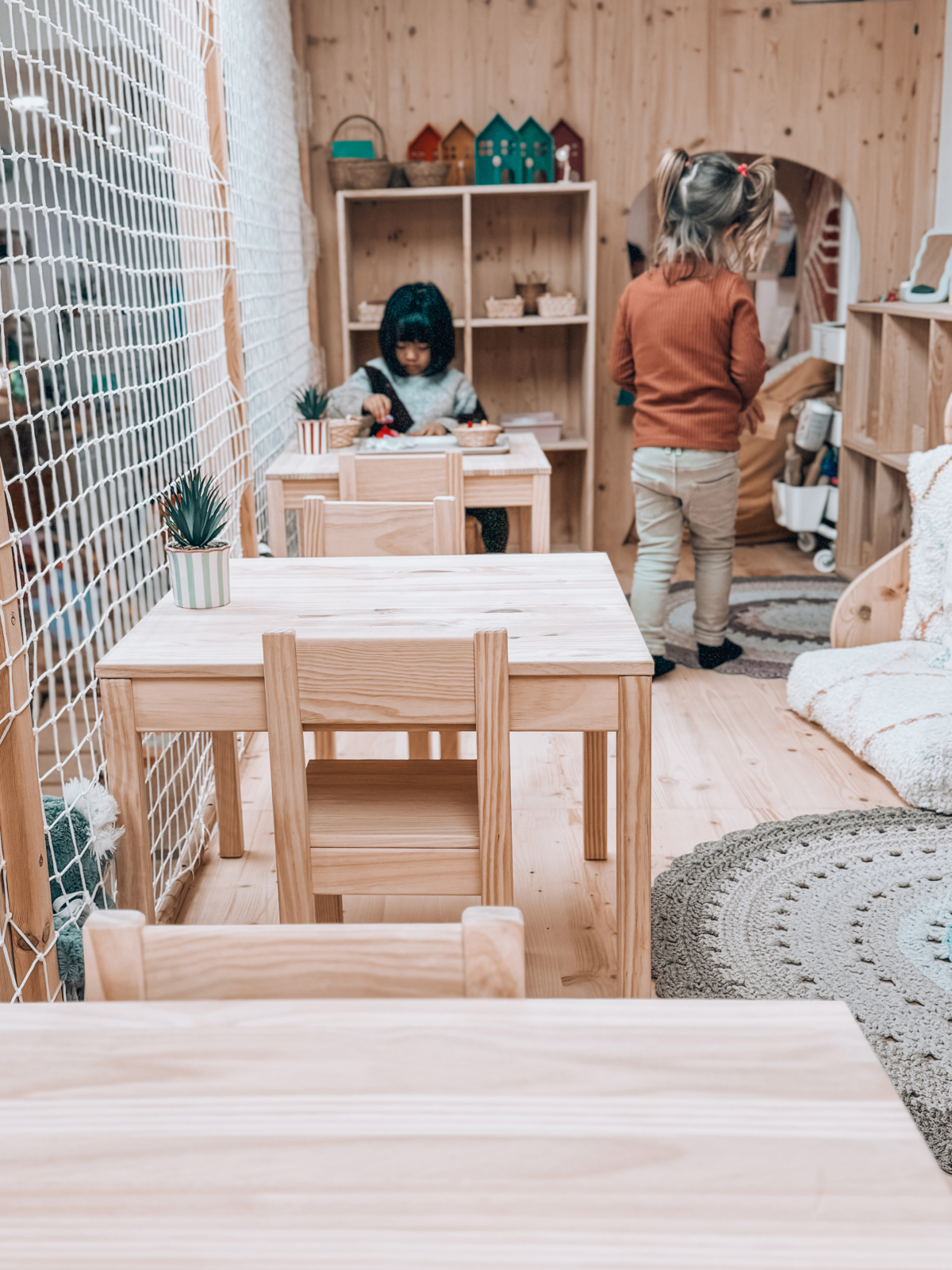 La méthode Montessori souligne l’importance de fournir aux enfants un environnement structuré mais flexible dans lequel ils peuvent explorer et apprendre de manière indépendante. Des bancs et des porte-manteaux à leur hauteur les aident à développer des habitudes d’autonomie et d’ordre, en réduisant les interruptions et en encourageant la responsabilité personnelle.