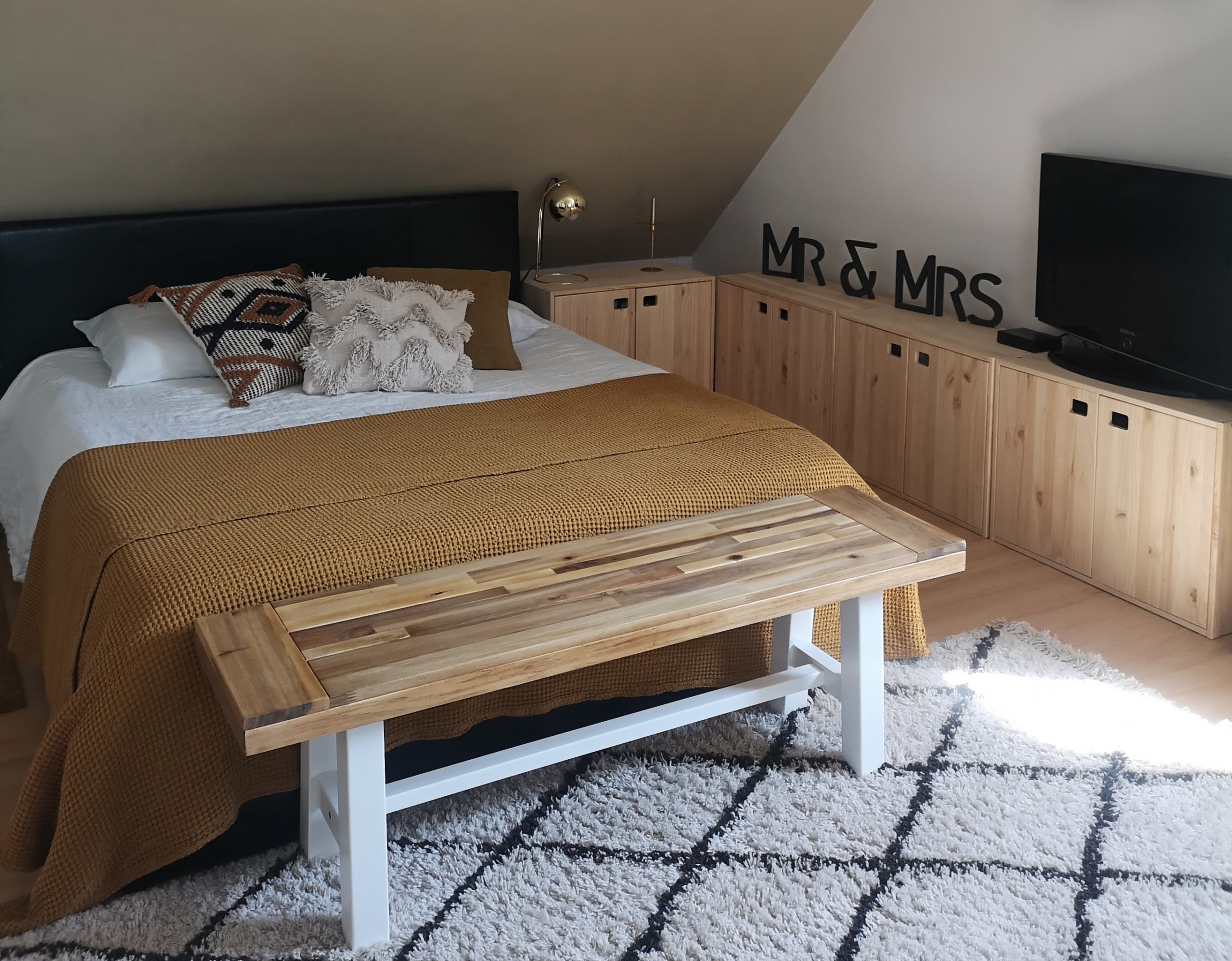 Le coffre en bois est un meuble multifonctionnel qui peut faire des merveilles dans votre chambre à coucher. Il est parfait pour ranger le linge de lit ou les objets que vous n’utilisez pas tous les jours mais que vous ne voulez pas jeter. Ce meuble offre un grand espace de rangement pour les couvertures, les oreillers et autres objets encombrants, ce qui permet de garder la chambre à coucher bien rangée et sans encombrement. Sa présence permet non seulement de maximiser le rangement, mais aussi d’apporter une solution pratique et élégante à l’organisation de la chambre à coucher.