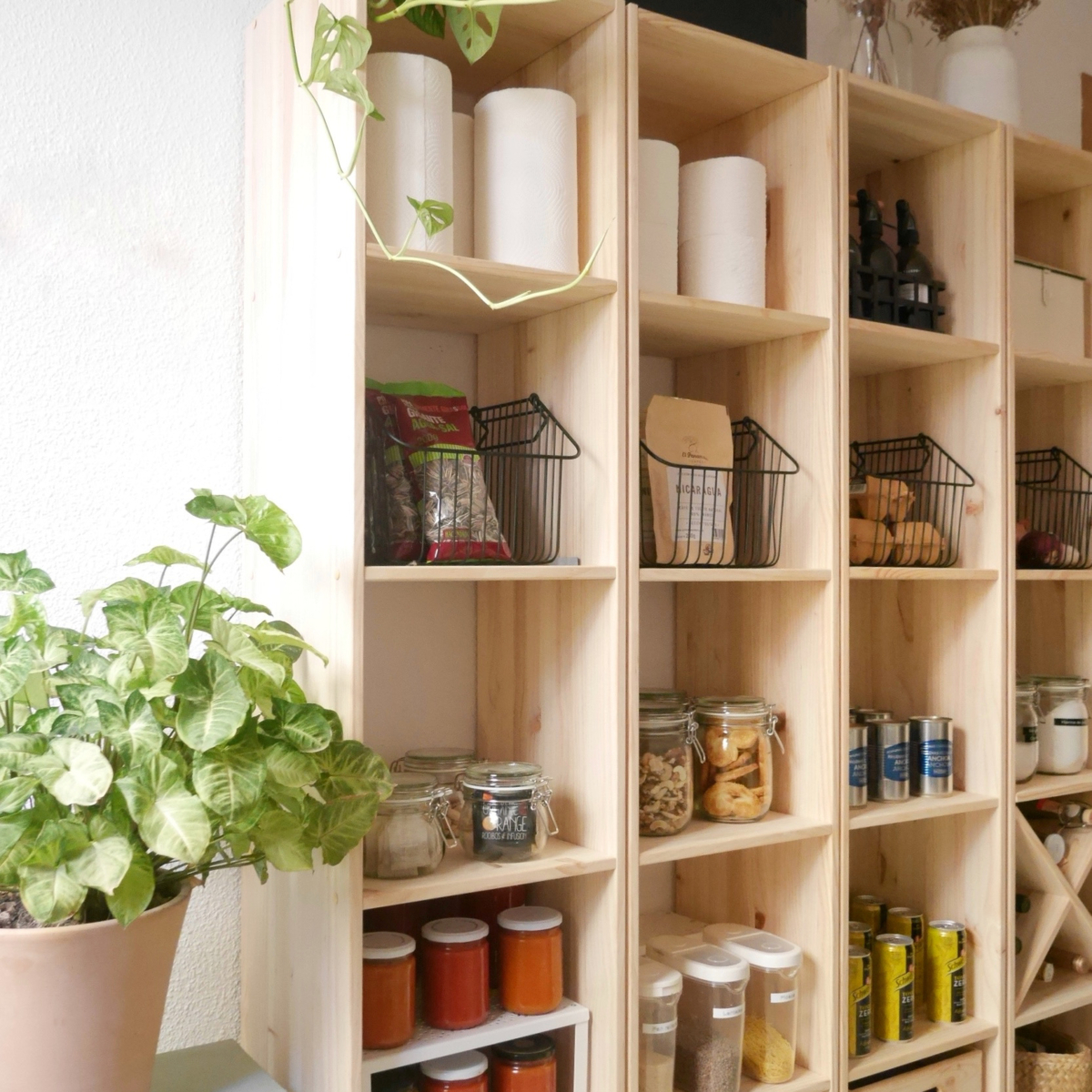 Les possibilités se multiplient grâce à leurs accessoires : caisses, étagères intermédiaires, croisillons, pieds ou tiroirs. Ces éléments permettent de personnaliser complètement le meuble, en l’adaptant à différents usages et styles.