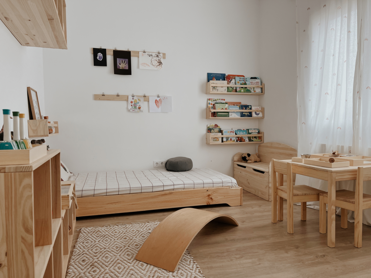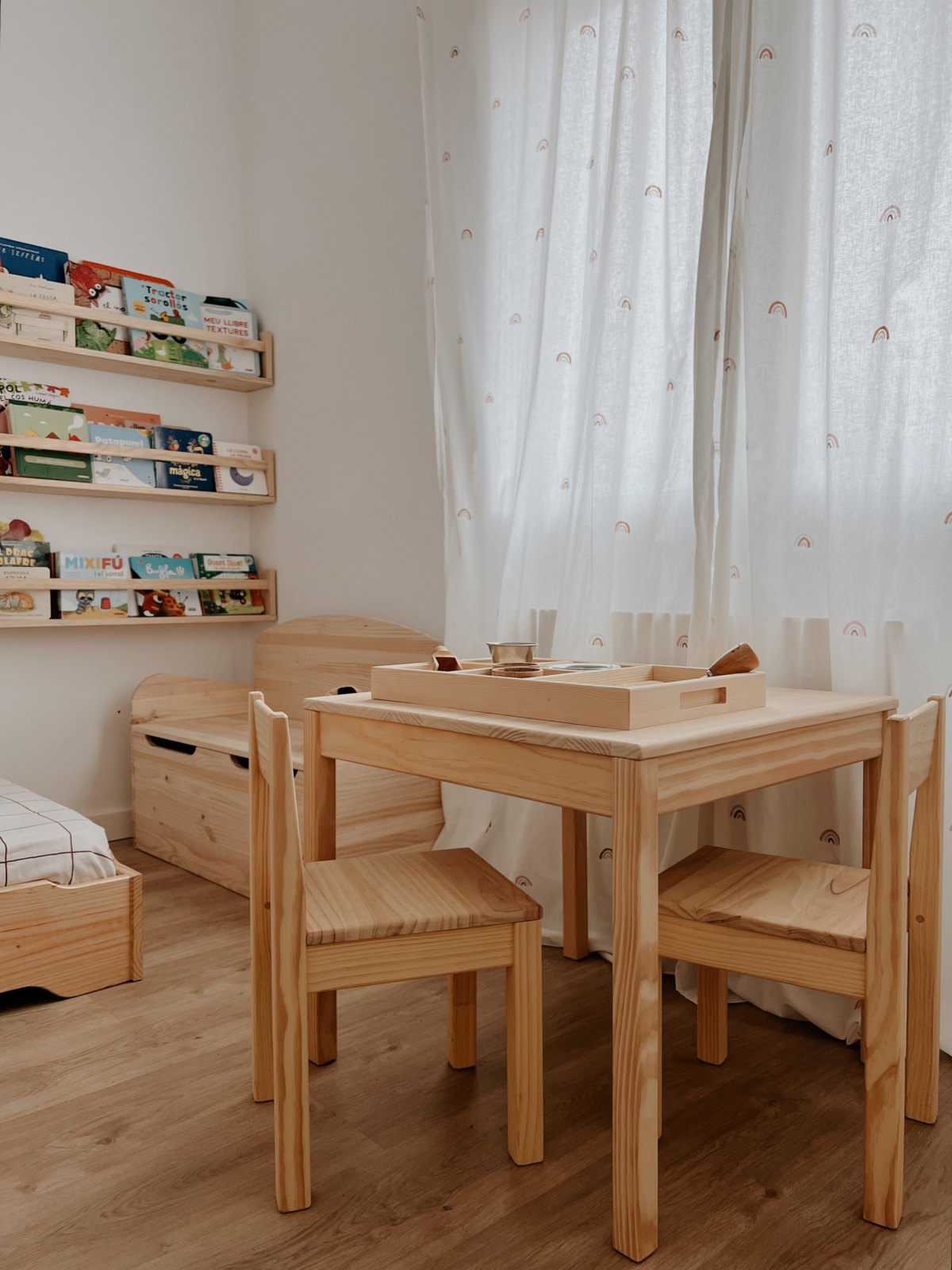 Aujourd’hui, nous vous invitons à découvrir la chambre de la filleule de Roser Moyano, qui se cache derrière le merveilleux compte Instagram @roser_home. Une chambre d’enfant en bois naturel qui respire la chaleur, décorée avec certains de nos meubles pour enfants. Cet espace, à la fois beau et fonctionnel, est conçu pour encourager l’autonomie et la créativité de l’enfant. Chaque recoin a été soigneusement pensé pour offrir un environnement harmonieux et stimulant, créant ainsi l’endroit idéal pour grandir et apprendre.