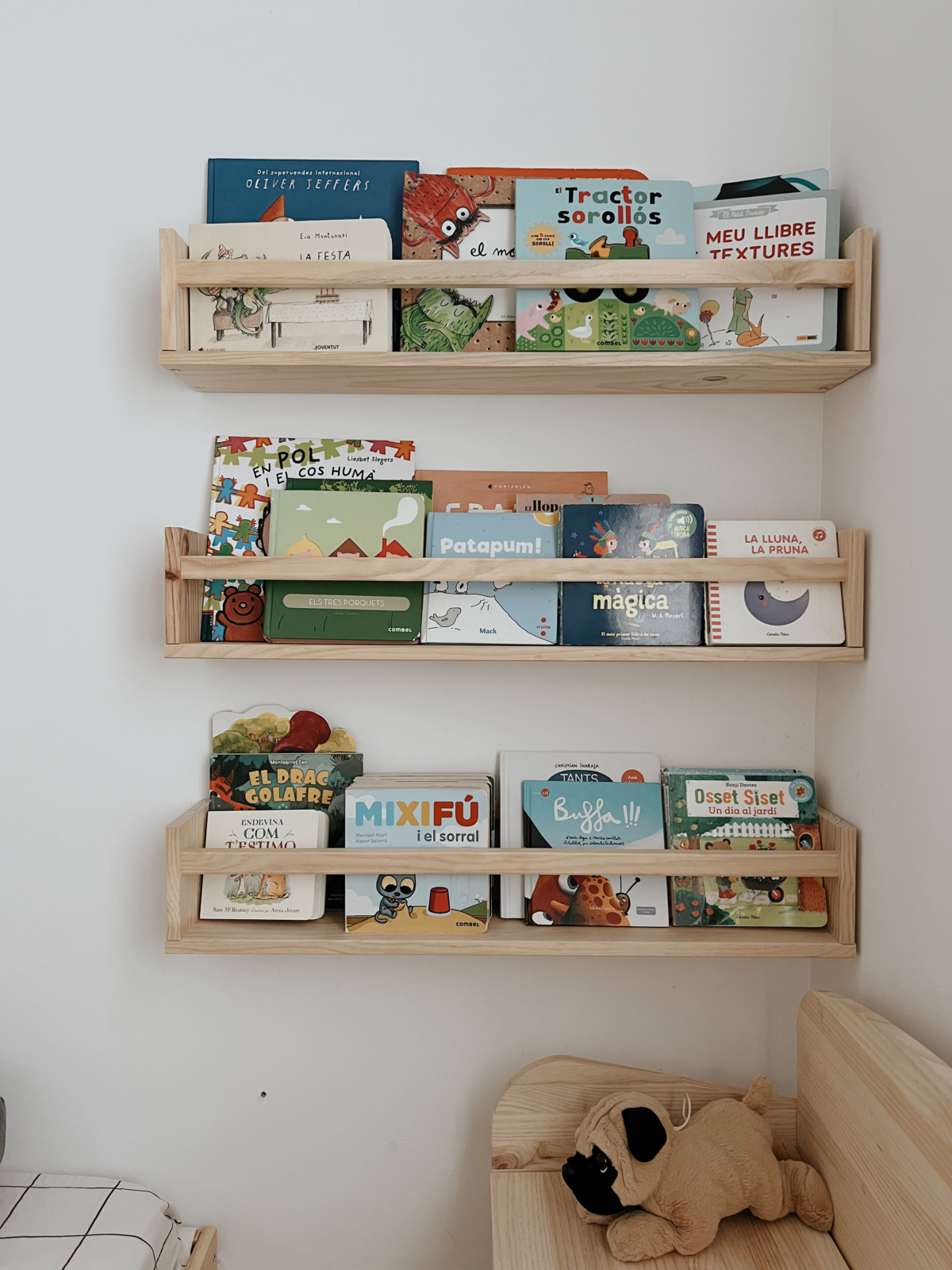 La magie de ce coin est qu’en plus de son utilité, il invite les enfants à se déconnecter et à s’immerger dans le monde des livres. À côté, trois bibliothèques Montessori placées à sa hauteur garantissent que les livres sont toujours accessibles. De plus, comme les livres ont une couverture visible, ils invitent les enfants à choisir et à explorer de manière simple, éveillant leur intérêt pour la lecture et l’organisation.