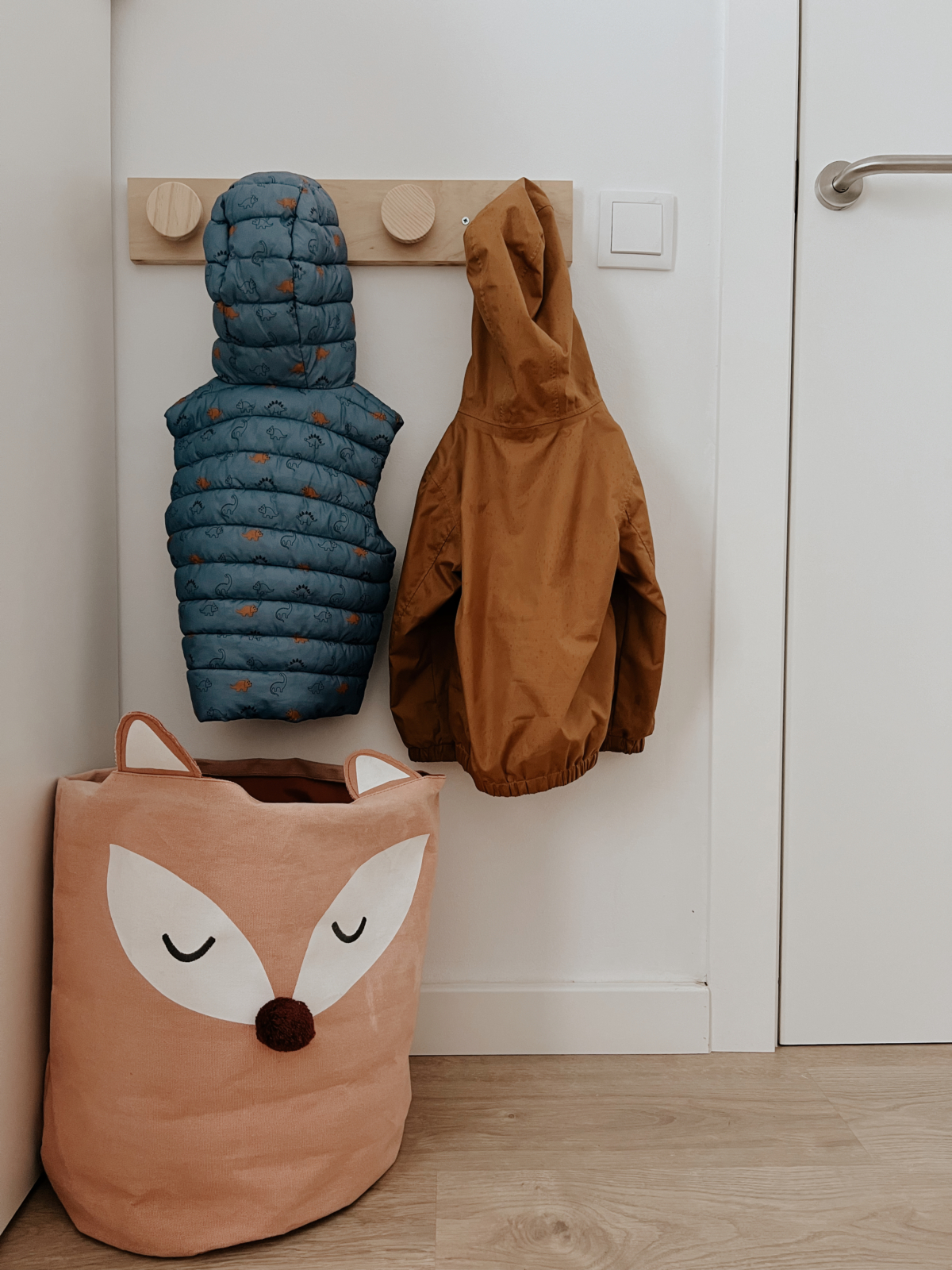 Un autre détail que nous aimons est le portemanteau en bois VERA, simple et pratique, avec quatre patères à hauteur des enfants. Ici, la veste, le sac à dos ou le bonnet ont leur place, encourageant l’enfant à ranger de manière autonome.