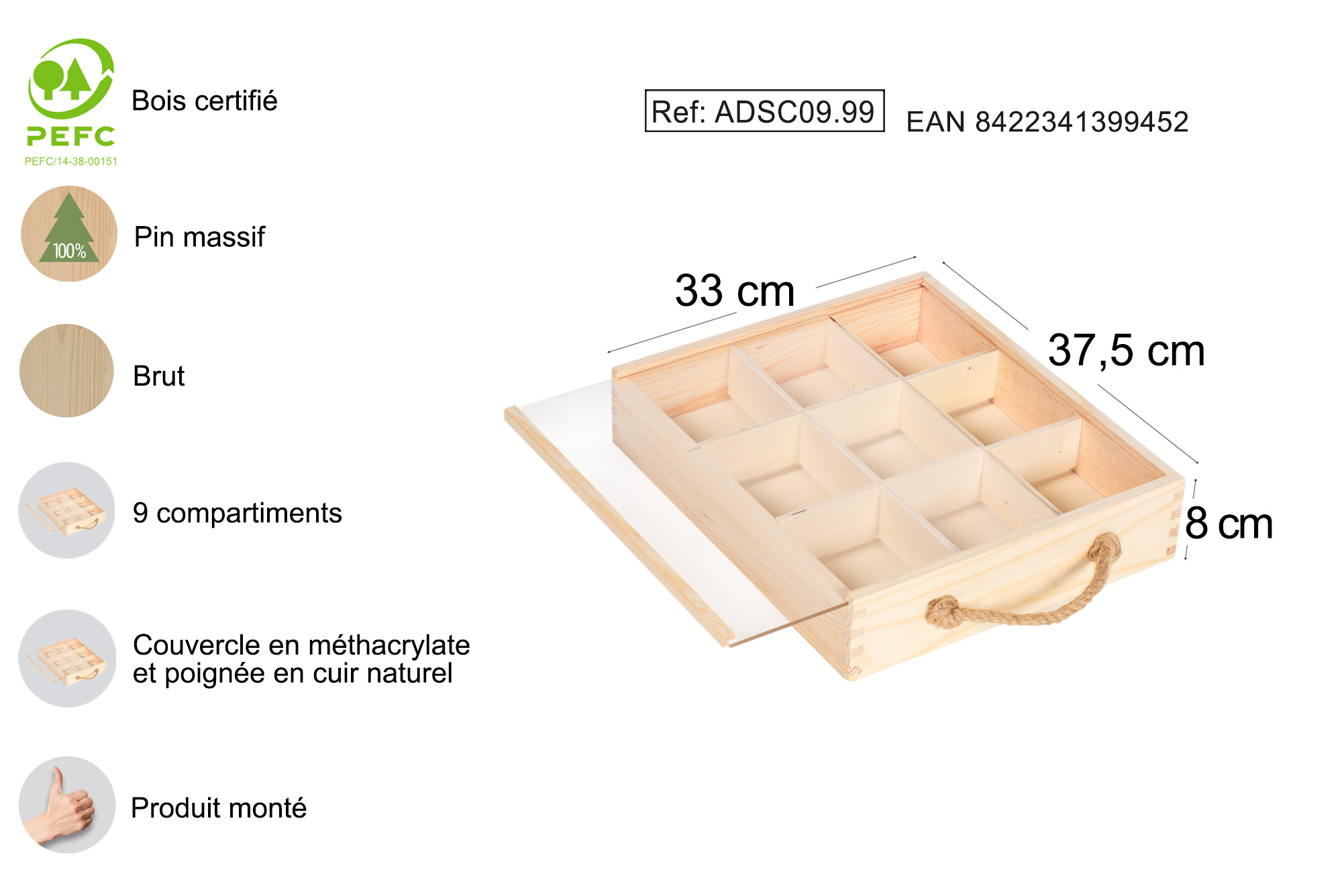 • Petite boîte en bois avec 9 sections pour trier et classer les petits objets