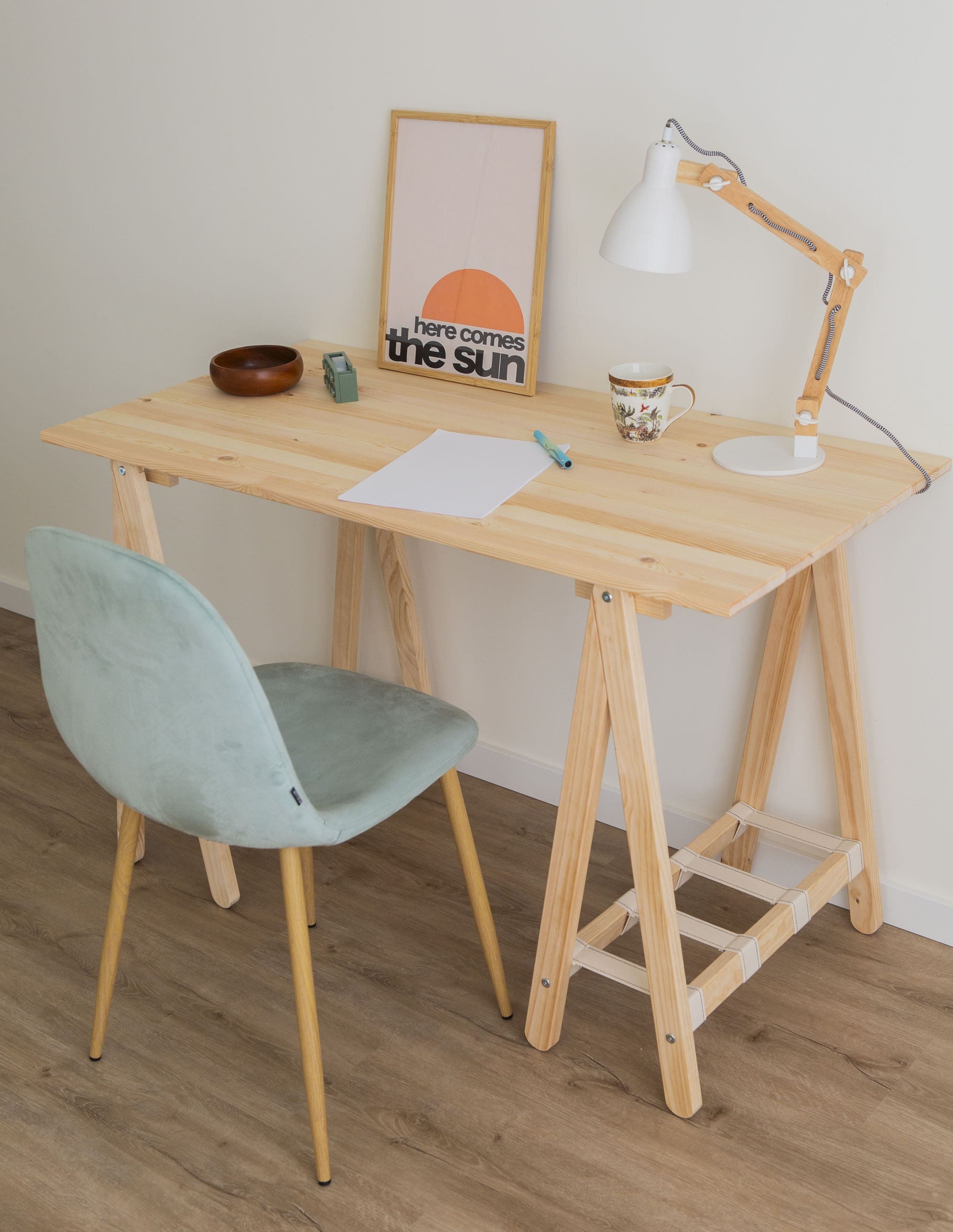 Ce bureau en bois ANCORA de 120×60 cm est conçu pour ceux qui apprécient la simplicité du naturel avec du caractère. Le bois apporte chaleur et offre une surface stable (120×60 cm) pour travailler confortablement. Les pieds, fabriqués en pin 100 % massif et local, avec un tube métallique blanc et des sangles 100 % coton cousues à la main, ajoutent personnalité et touche artisanale. Son style nordique s’intègre parfaitement dans un bureau, une maison, un coin étude ou un home office.
