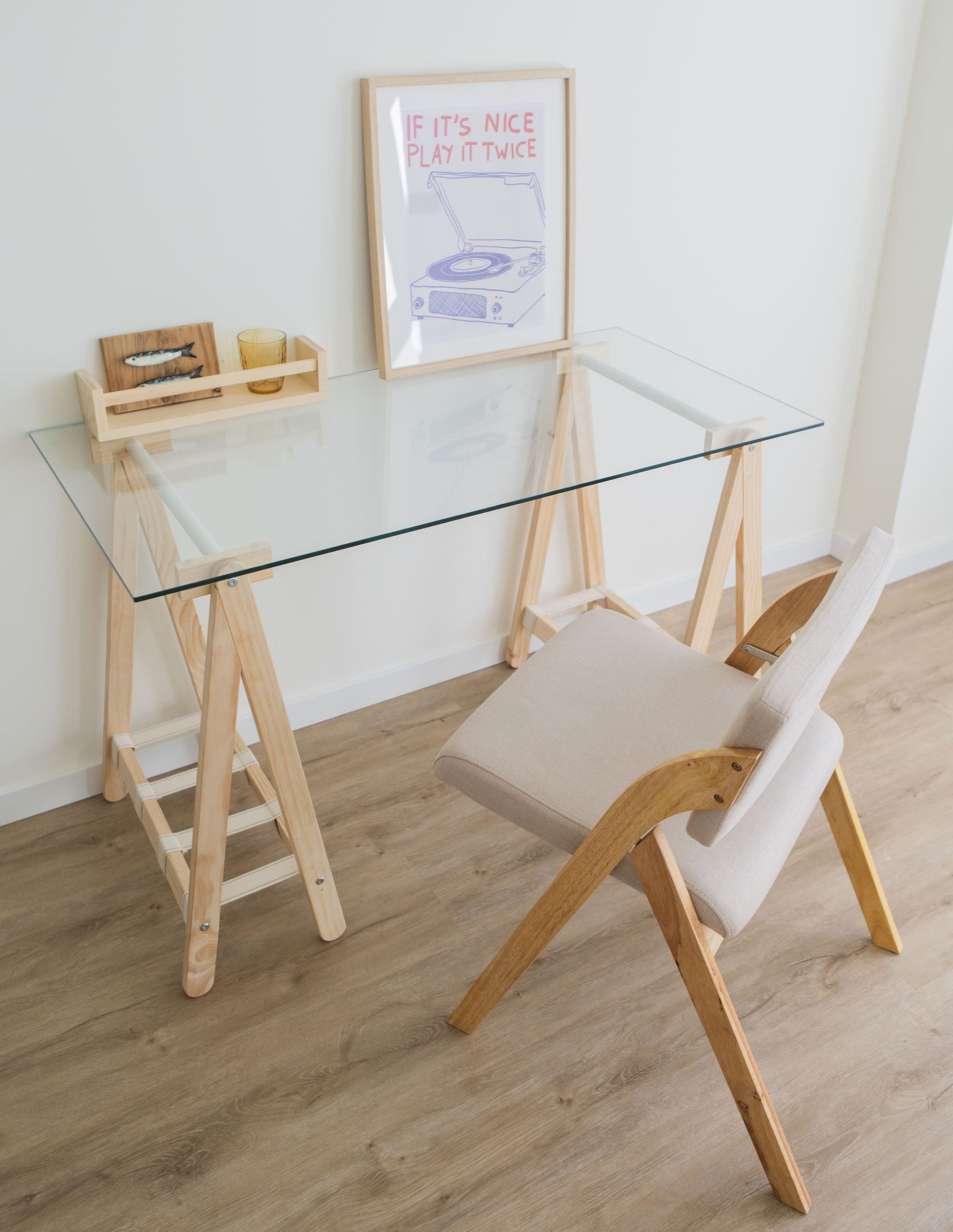 Bureau ANCORA avec plateau en verre 120×60 cm et pieds en bois et textile