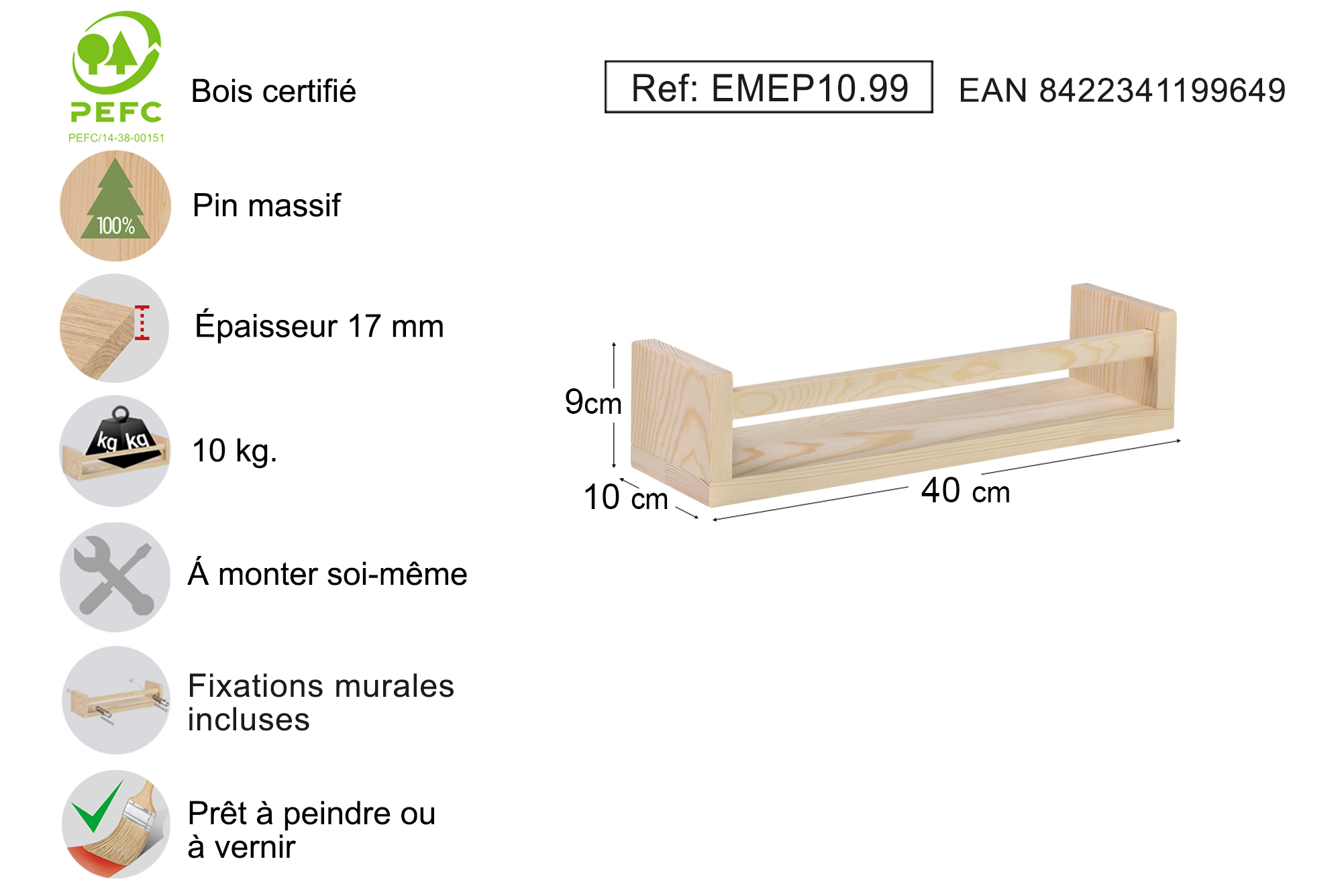 Fabriquée en bois massif de pin, elle est résistante, durable et naturellement belle. Tu peux la laisser telle quelle ou lui donner ta touche personnelle en la peignant ou en la vernissant. Le résultat : une étagère à épices en bois qui ne se contente pas de ranger, mais qui apporte aussi du style, de la chaleur et une touche naturelle à ton intérieur.