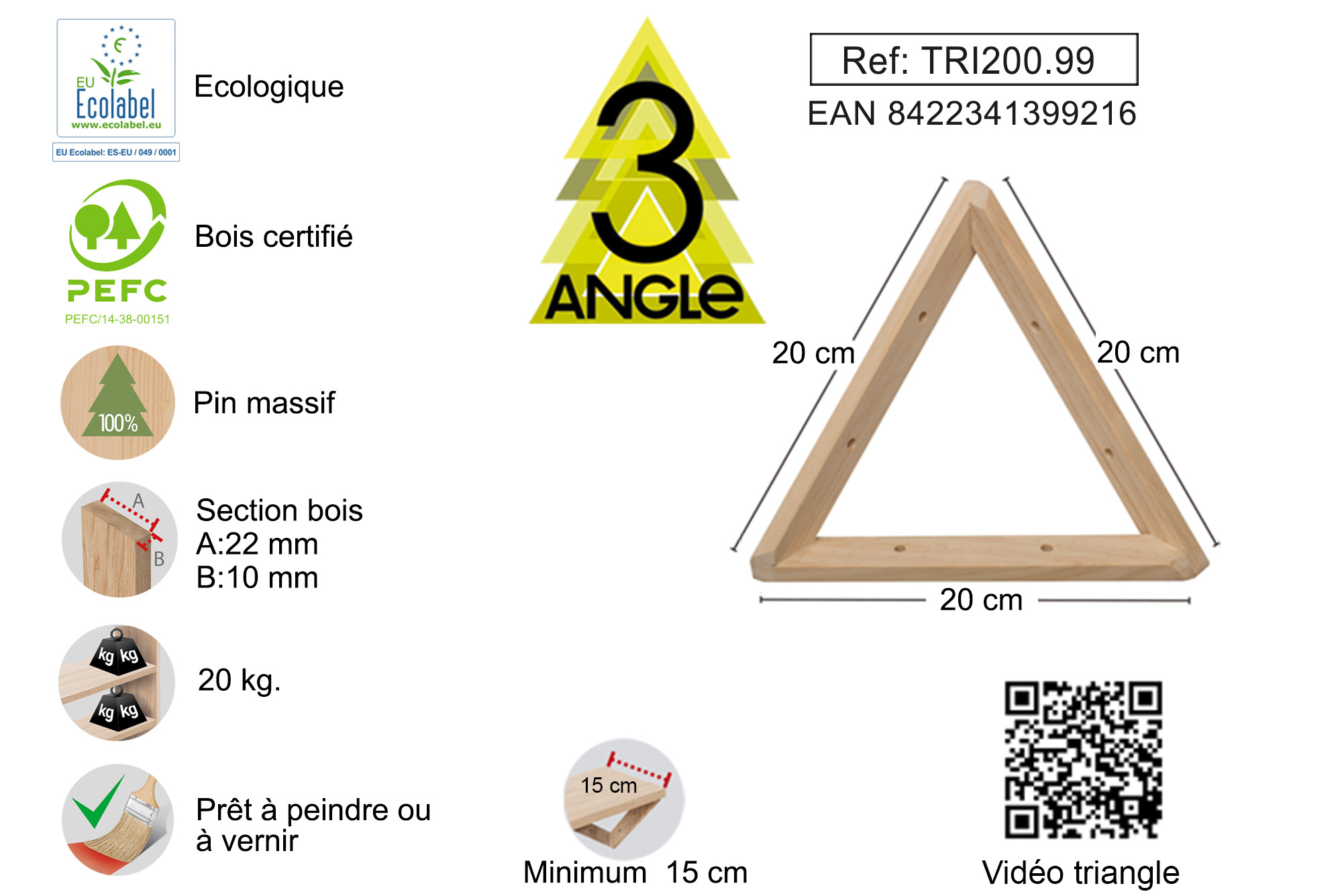 Chacun détail compte, et encore plus dans la décoration. Vous en avez assez des tablettes qui n’apportent rien ? Innovez et donnez-leur plus d’élégance avec un support original et créatif. Cette équerre en pin massif est la solution parfaite pour égayer n'importe quel mur. Vous pouvez la placer dans de multiples positions, aussi bien au-dessus qu'en dessous de l'étagère, et ainsi créer un nombre infini de compositions décoratives et personnalisées. Elle mesure 20x20x20 cm et s'appelle TRIANGLE.