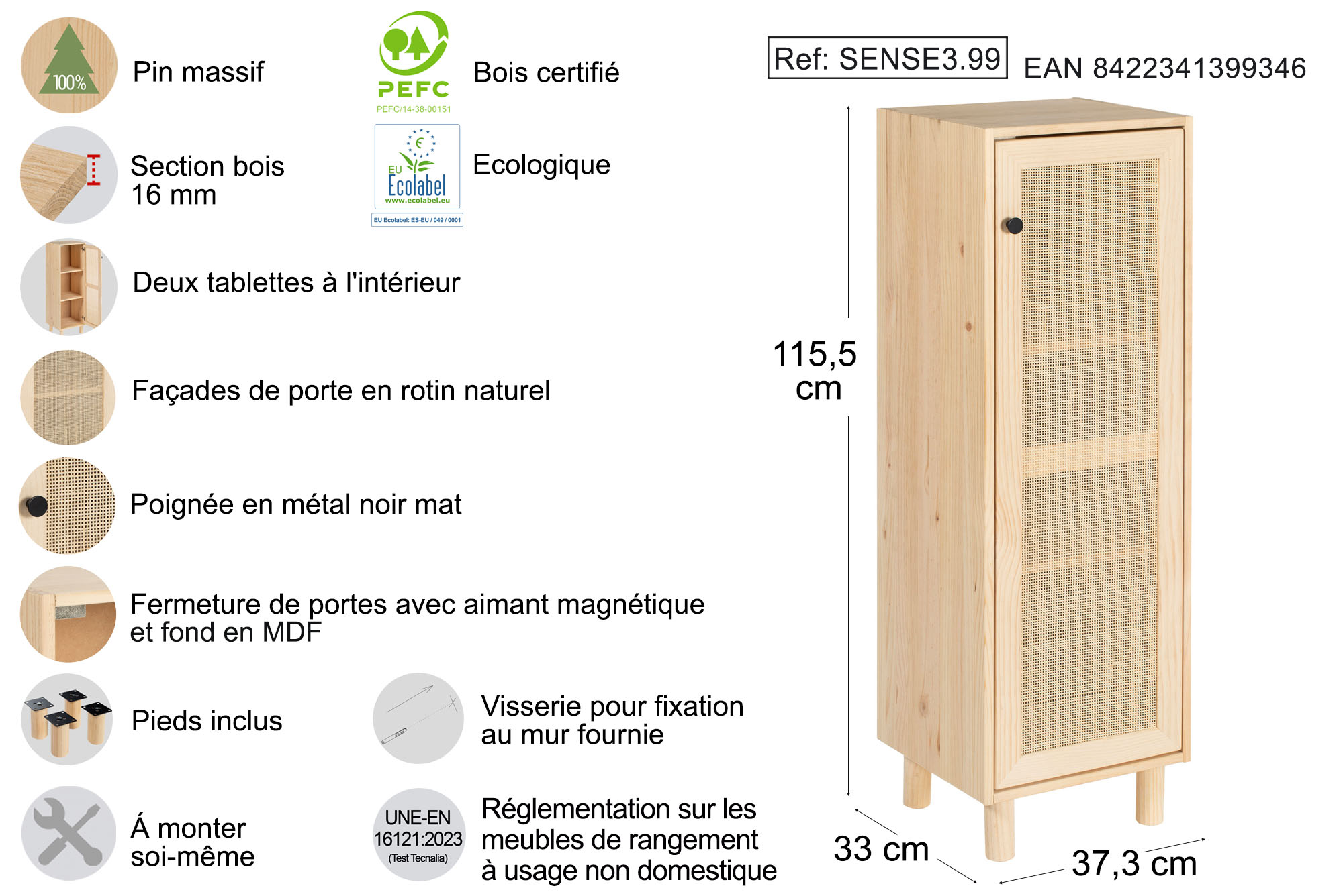 Découvrez la beauté naturelle et l'élégance intemporelle de notre armoire verticale 1 porte en rotin de la collection SENSE. Ce meuble associe le bois de pin au rotin, un matériau solide et durable tressé à la main, à la texture douce et à la beauté unique, qui confère à tout espace un aspect très naturel.