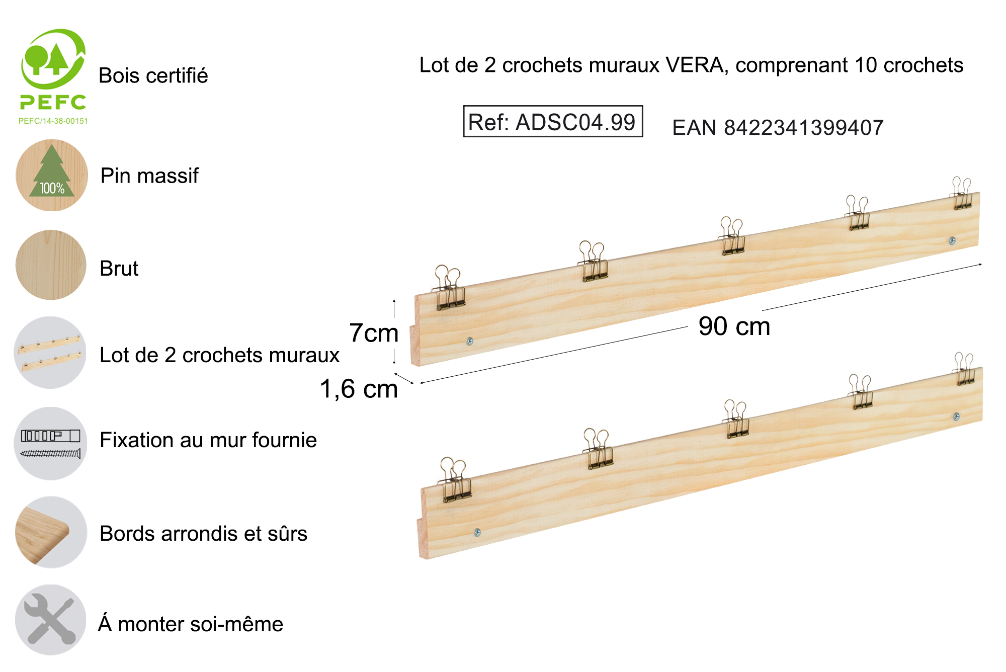 • Mesure de chaque support : Hauteur 7 x Largeur 90 x Profondeur 1,6 cm