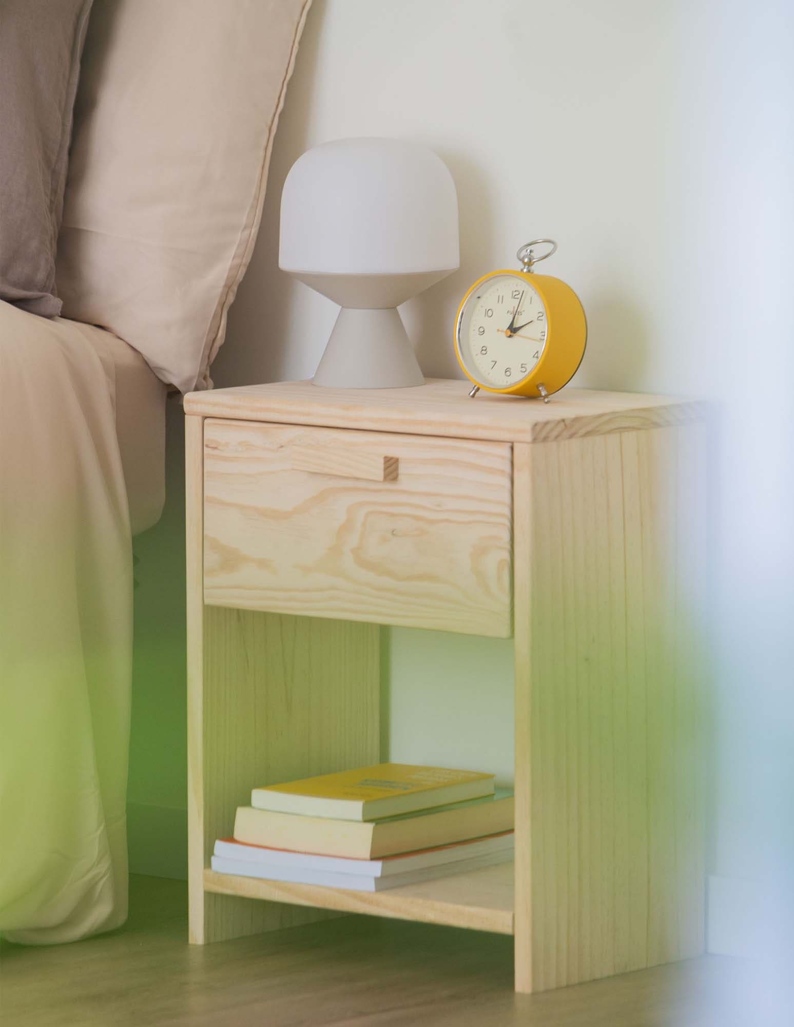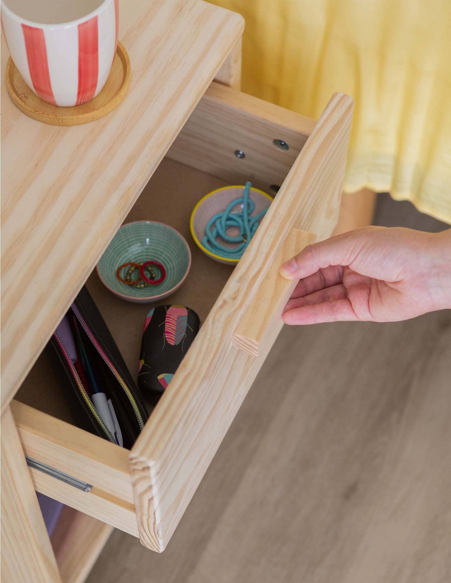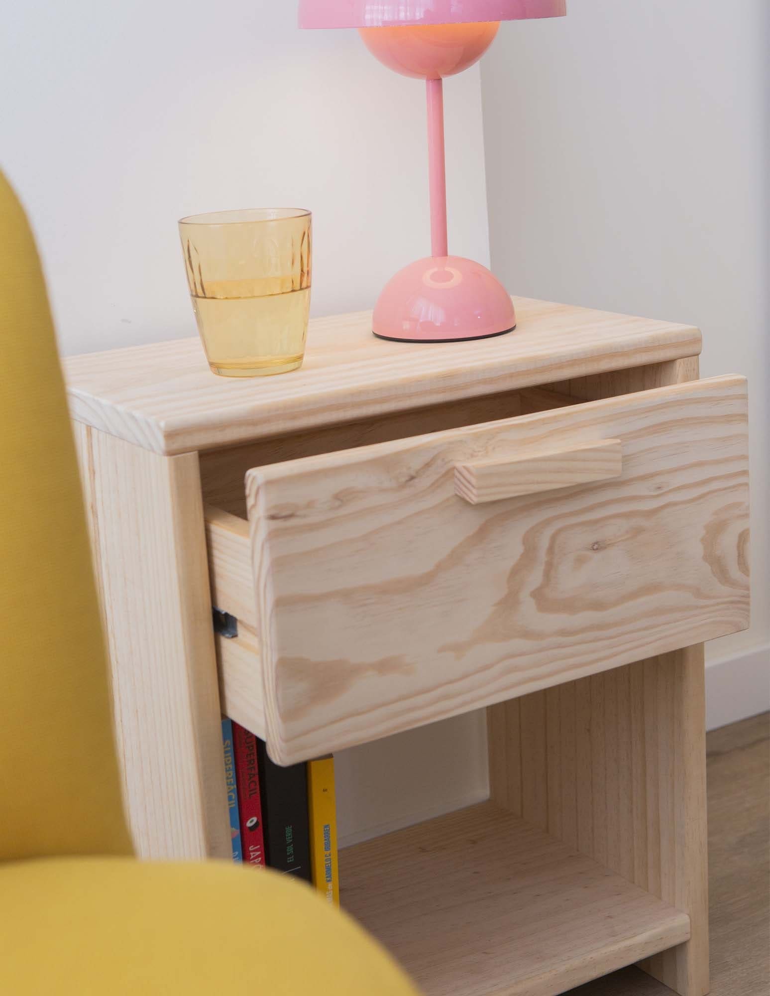 Cette table de chevet en pin certifié PEFC est dotée d’un tiroir avec glissières métalliques de qualité, garantissant une ouverture fluide et durable. Elle dispose également d’une étagère inférieure, parfaite pour garder à portée de main livres, accessoires ou objets du quotidien. Sa poignée en bois, simple et naturelle, complète un design épuré qui inspire sérénité.