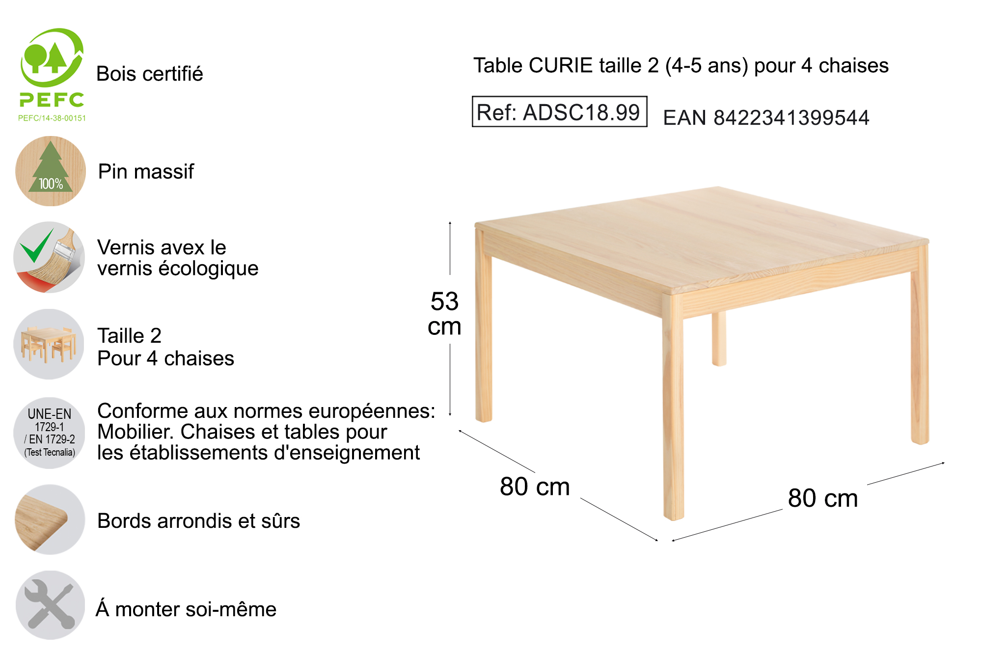 • Normes UNE-EN 1729-1 / EN 1729-2 pour les chaises et tables pour centres éducatifs, garantissant l'ergonomie, la solidité et la sécurité des enfants